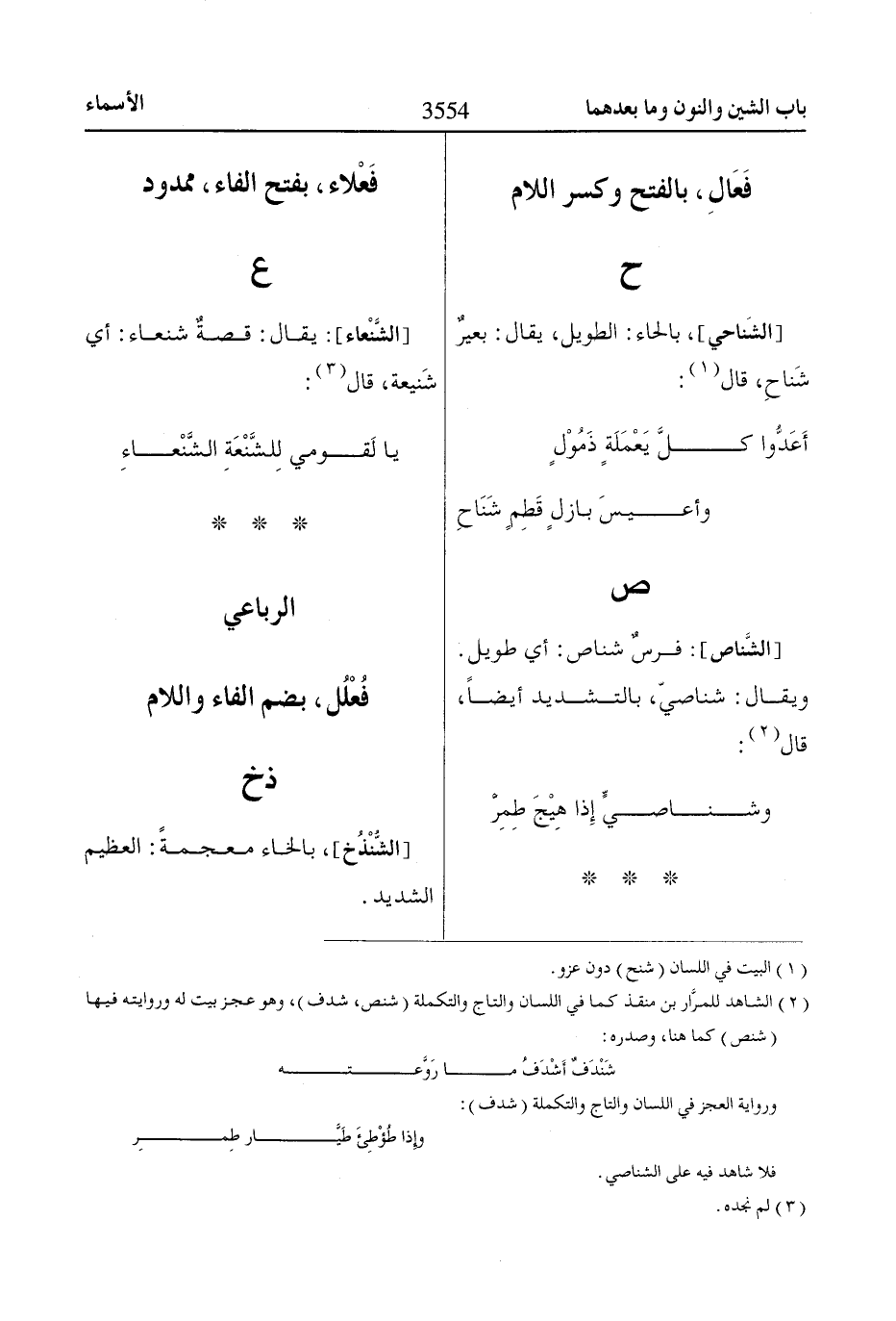 [الشَناحي]، بالحاء: الطويل، يقال: بعيرٌ شَناحِ، قال «1»: