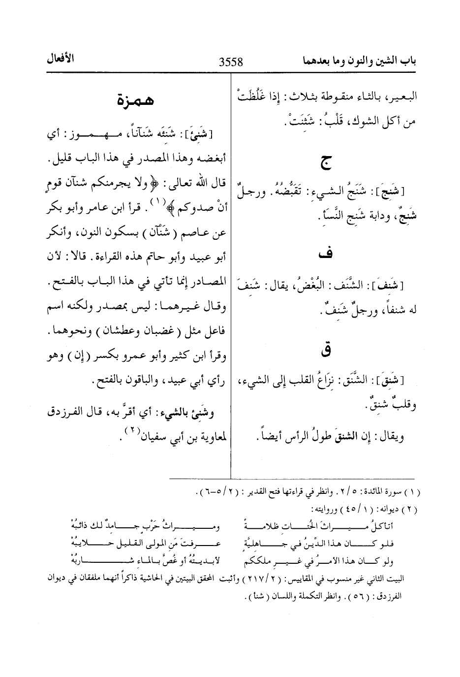 قال اللّاه تعالى: وَلاا يَجْرِمَنَّكُمْ شَنَآنُ قَوْمٍ أَنْ صَدُّوكُمْ «1». قرأ ابن عامر وأبو بكر عن عاصم (شَنْآن) بسكون النون، وأنكر أبو عبيد وأبو حاتم هذه القراءة. قالا: لأن المصادر إِنما تأتي في هذا الباب بالفتح.