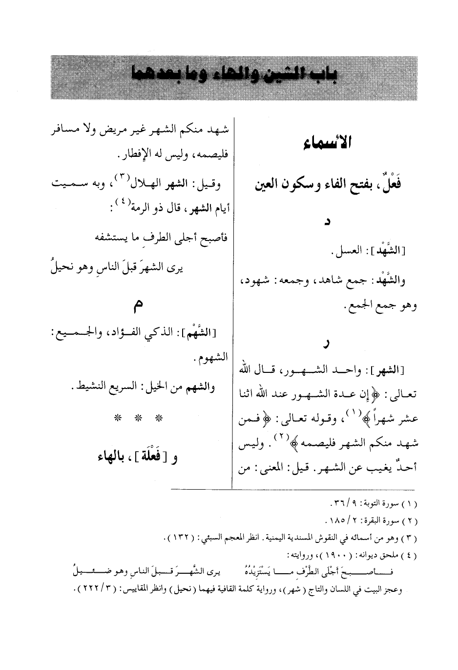 [الشهر]: واحد الشهور، قال اللّاه تعالى: إِنَّ عِدَّةَ الشُّهُورِ عِنْدَ اللّاهِ اثْناا عَشَرَ شَهْراً «1»، وقوله تعالى: فَمَنْ شَهِدَ مِنْكُمُ الشَّهْرَ فَلْيَصُمْهُ «2». وليس أحدٌ يغيب عن الشهر. قيل: المعنى: من شهد منكم الشهر غير مريض ولا مسافر فليصمه، وليس له الإِفطار.