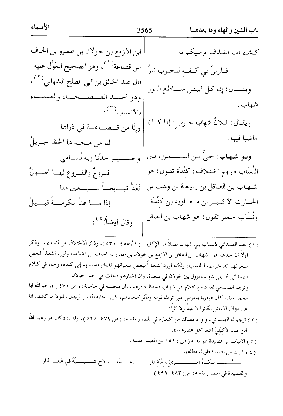 (1) عقد الهمداني لأنساب بني شهاب فصلًا في الإِكليل: (1/ 455 - 534)، وذكر الاختلاف في أنسابهم، وذكر أولًا أن جدهم هو: شهاب بن العاقل بن الأزمع بن خولان بن عمرو بن الحاف بن قضاعة، وأورد أشعاراً لبعض شعرائهم تفاخر بهذا النسب، ولكنه أورد أشعاراً لبعض شعرائهم تفخر بنسبهم إِلى كندة، وجاء في كلام الهمداني أن بني شهاب نزول بين خولان في صعدة، وأن أخبارهم دخلت في أخبار خولان.