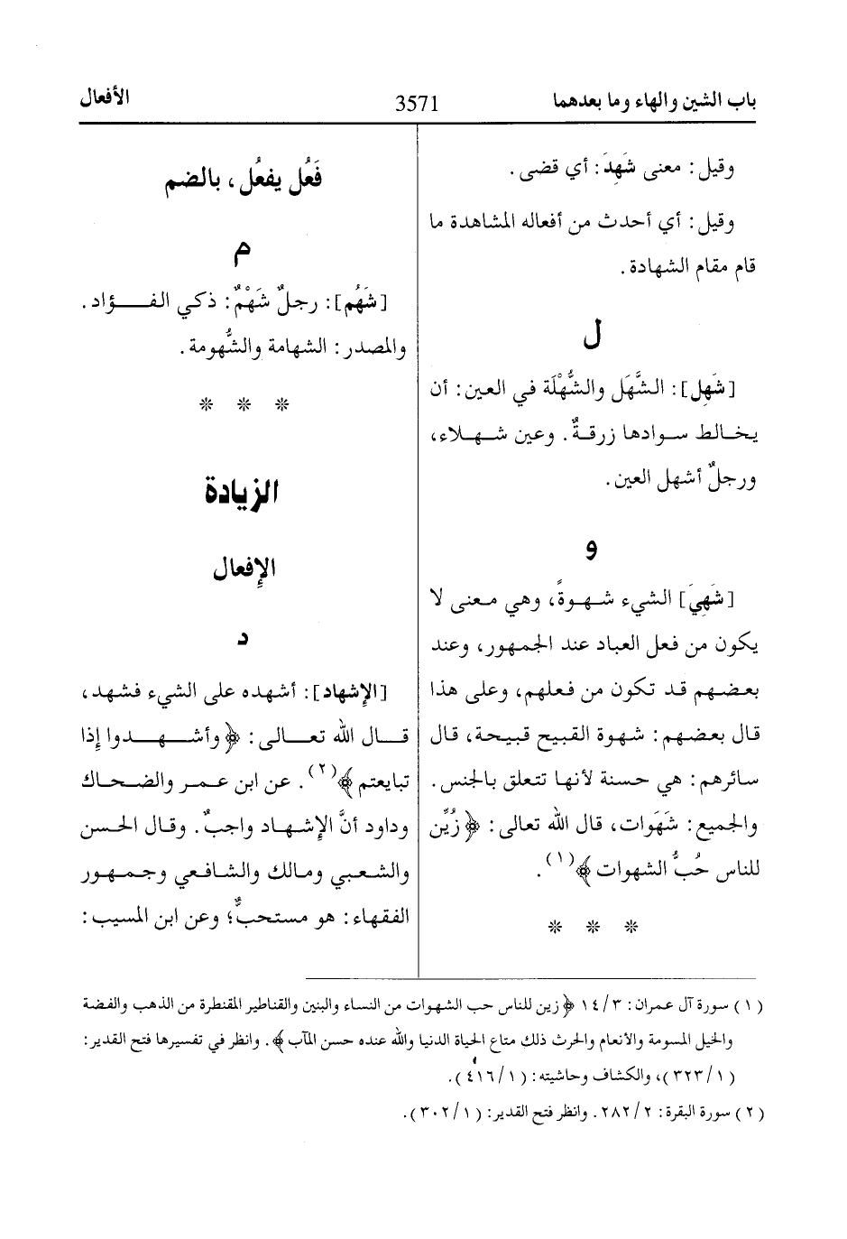 (1) سورة آل عمران: 3/ 14 زُيِّنَ لِلنّااسِ حُبُّ الشَّهَوااتِ مِنَ النِّسااءِ وَالْبَنِينَ وَالْقَنااطِيرِ الْمُقَنْطَرَةِ مِنَ الذَّهَبِ وَالْفِضَّةِ وَالْخَيْلِ الْمُسَوَّمَةِ وَالْأَنْعاامِ وَالْحَرْثِ ذالِكَ مَتااعُ الْحَيااةِ الدُّنْياا وَاللّاهُ عِنْدَهُ حُسْنُ الْمَآبِ. وانظر في تفسيرها فتح القدير: