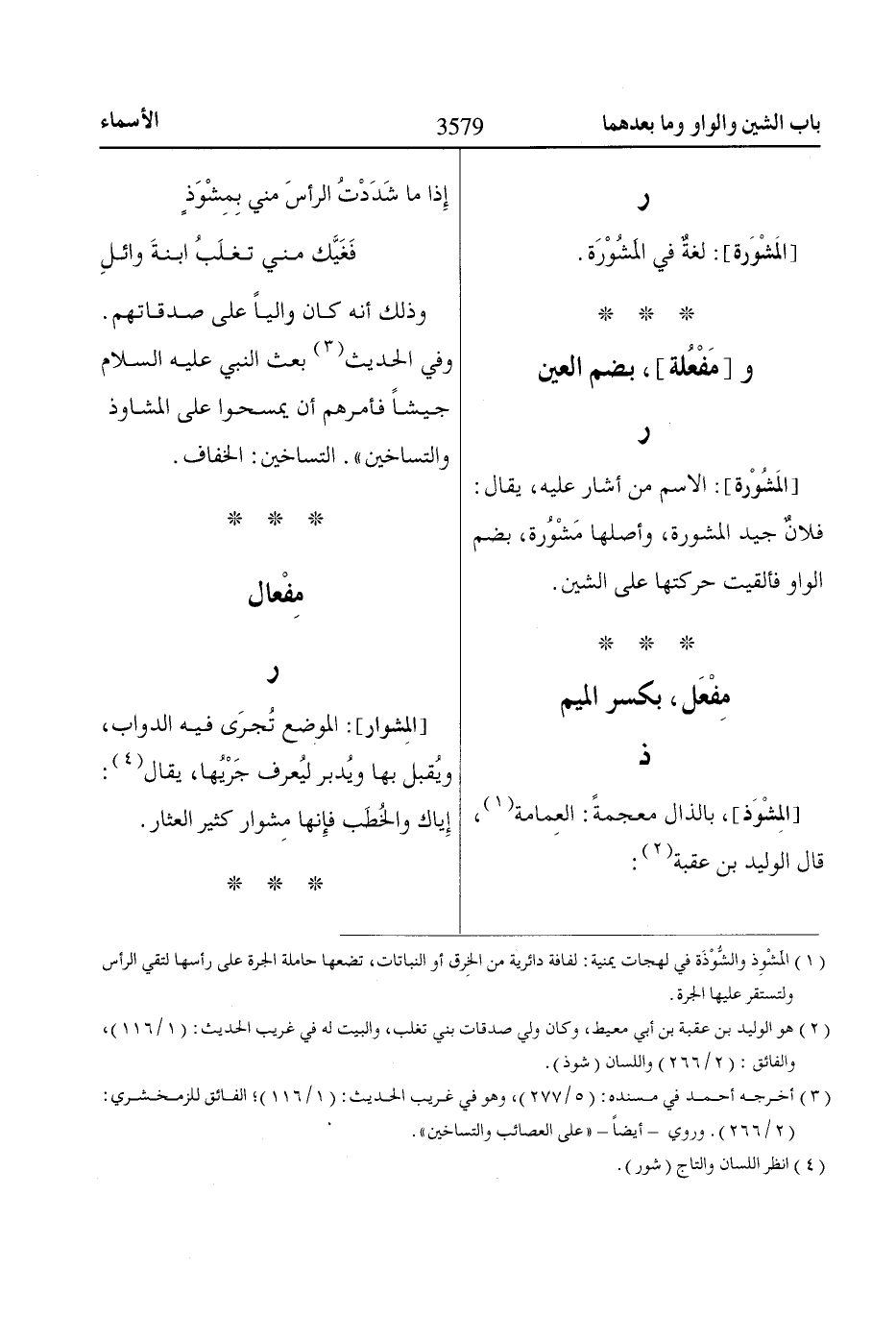 [المِشْوَذ]، بالذال معجمةً: العِمامة «1»، قال الوليد بن عقبة «2»: