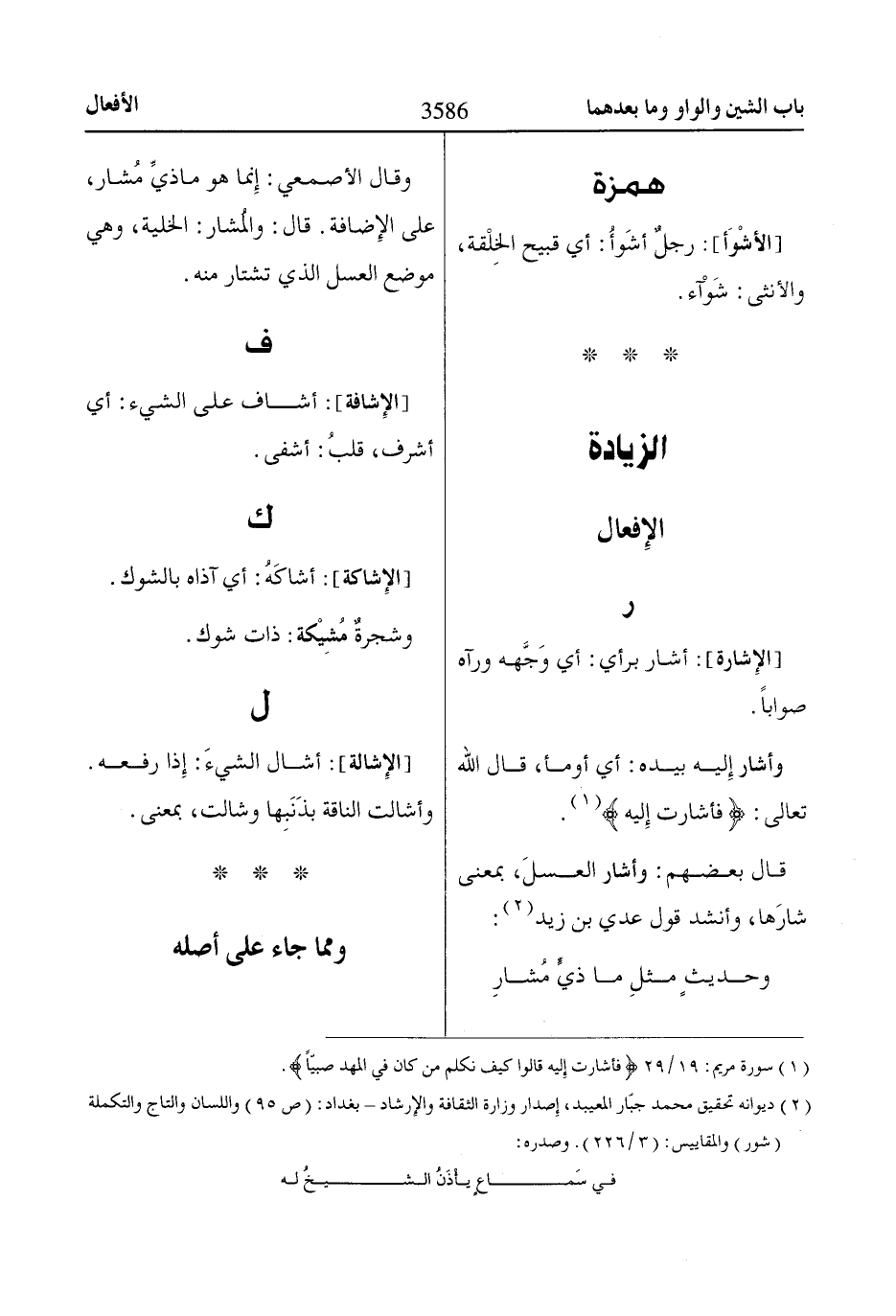 (2) ديوانه تحقيق محمد جبّار المعيبد، إِصدار وزارة الثقافة والإِرشاد- بغداد: (ص 95) واللسان والتاج والتكملة (شور) والمقاييس: (3/ 226). وصدره: