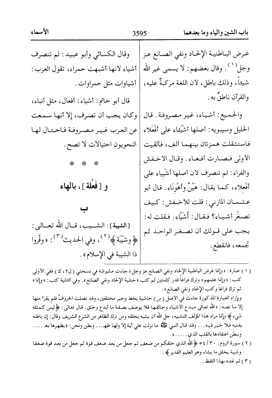 قال أبو حاتم: أشياء: أفعال، مثل أنباء، وكان يجب أن تصرف، إِلا أنها سمعت عن العرب غير مصروفة فاحتال لها النحويون احتيالات لا تصح.