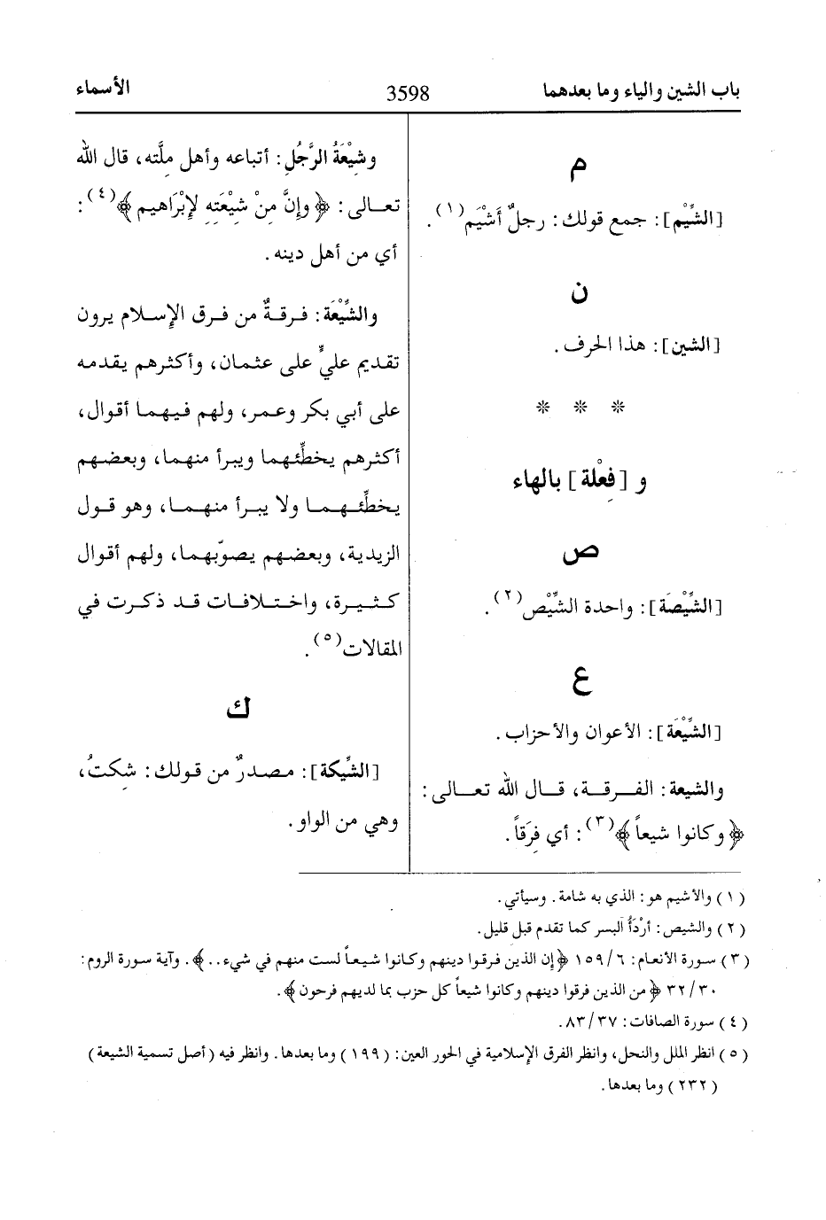 والشِّيْعَة: فرقةٌ من فرق الإِسلام يرون تقديم عليٍّ على عثمان، وأكثرهم يقدمه على أبي بكر وعمر، ولهم فيهما أقوال، أكثرهم يخطِّئهما ويبرأ منهما، وبعضهم يخطِّئهما ولا يبرأ منهما، وهو قول الزيدية، وبعضهم يصوّبهما، ولهم أقوال كثيرة، واختلافات قد ذكرت في المقالات «5».