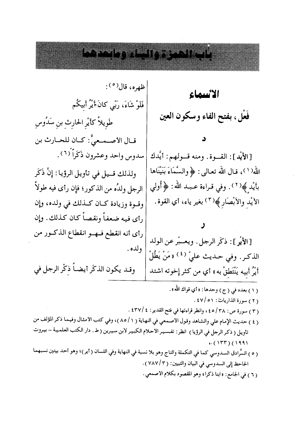 (4) حديث الإِمام علي والشاهد وقول الأصمعي في النهاية (1/ 85)، وفي كتب الأمثال وفيما ذكر المؤلف من تأويل (ذكر الرجل في الرؤيا) انظر: تفسير الأحلام الكبير لابن سيرين (ط. دار الكتب العلمية- بيروت 1991) (133).