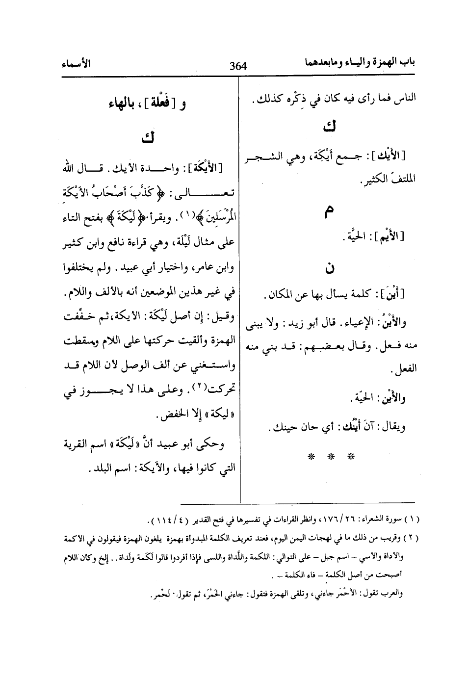 [الأَيْكَة]: واحدة الأيك. قال اللّاه تعالى: كَذَّبَ أَصْحاابُ الْأَيْكَةِ الْمُرْسَلِينَ «1». ويقرأ. لَيْكَةَ بفتح التاء على مثال لَيْلَة، وهي قراءة نافع وابن كثير وابن عامر، واختيار أبي عبيد. ولم يختلفوا في غير هذين الموضعين أنه بالألف واللام.