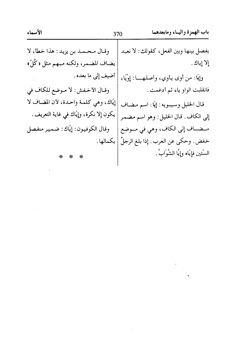 قال الخليل وسيبويه: إِيّا: اسم مضاف إِلى الكاف. قال الخليل: وهو اسم مضمر مضاف إِلى الكاف، وهي في موضع خفض. وحكى عن العرب. إِذا بلغ الرجلُ السّتين فإِيّاه وإِيِّا الشَّوَابِّ.