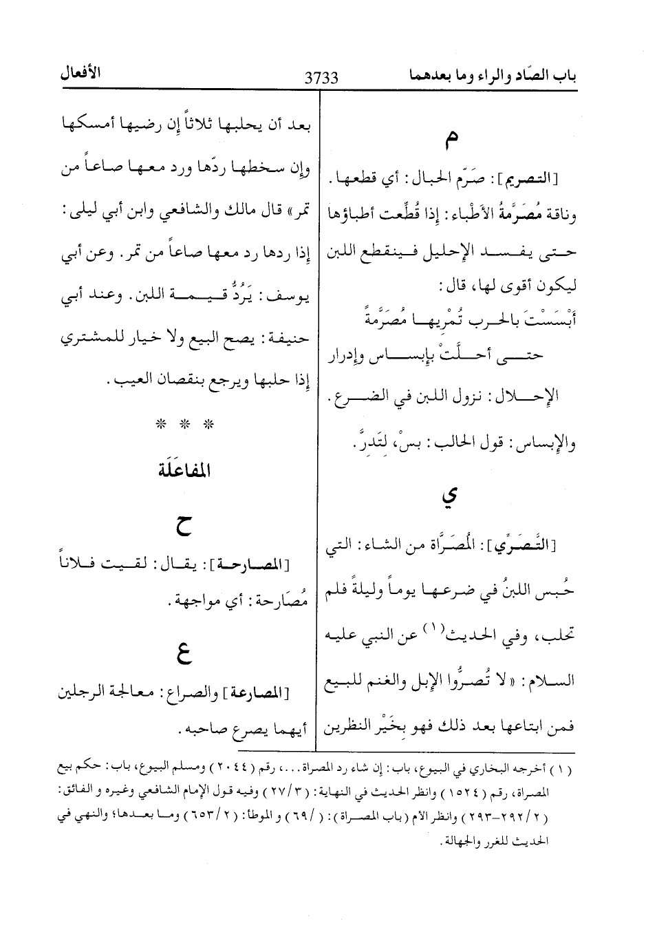 (1) أخرجه البخاري في البيوع، باب: إِن شاء رد المصراة ... ، رقم (2044) ومسلم البيوع، باب: حكم بيع المصراة، رقم (1524) وانظر الحديث في النهاية: (3/ 27) وفيه قول الإِمام الشافعي وغيره والفائق: