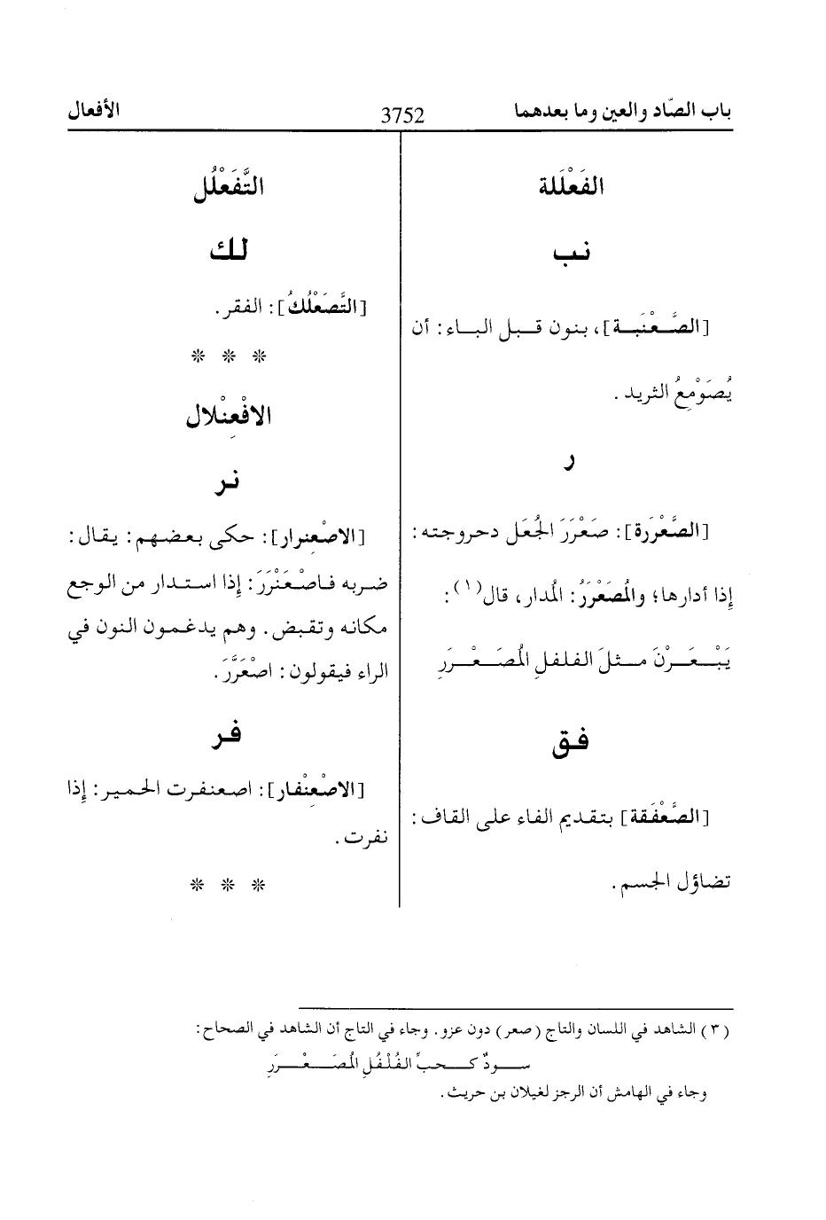 ضربه فاصْعَنْرَرَ: إِذا استدار من الوجع مكانه وتقبض. وهم يدغمون النون في الراء فيقولون: اصْعَرَّرَ.