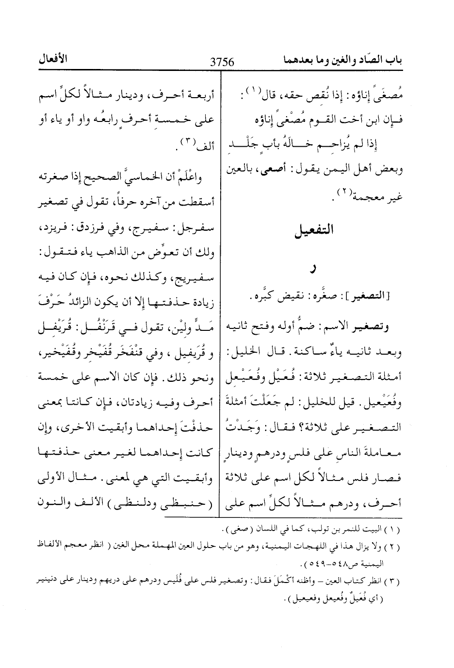 (3) انظر كتاب العين- وأظنه أكْمَلَ فقال: وتصغير فلس على فُلَيس ودرهم على دريهم ودينار على دنينير (أي فُعَيلٌ وفُعيعل وفعيعيل).