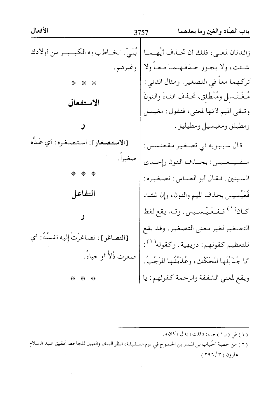 قُعَيْسيس بحذف الميم والنون، وإِن شئت كان «1» قفعَيْسيس. وقد يقع لفظ التصغير لغير معنى التصغير. وقد يقع للتعظيم كقولهم: دويهية.