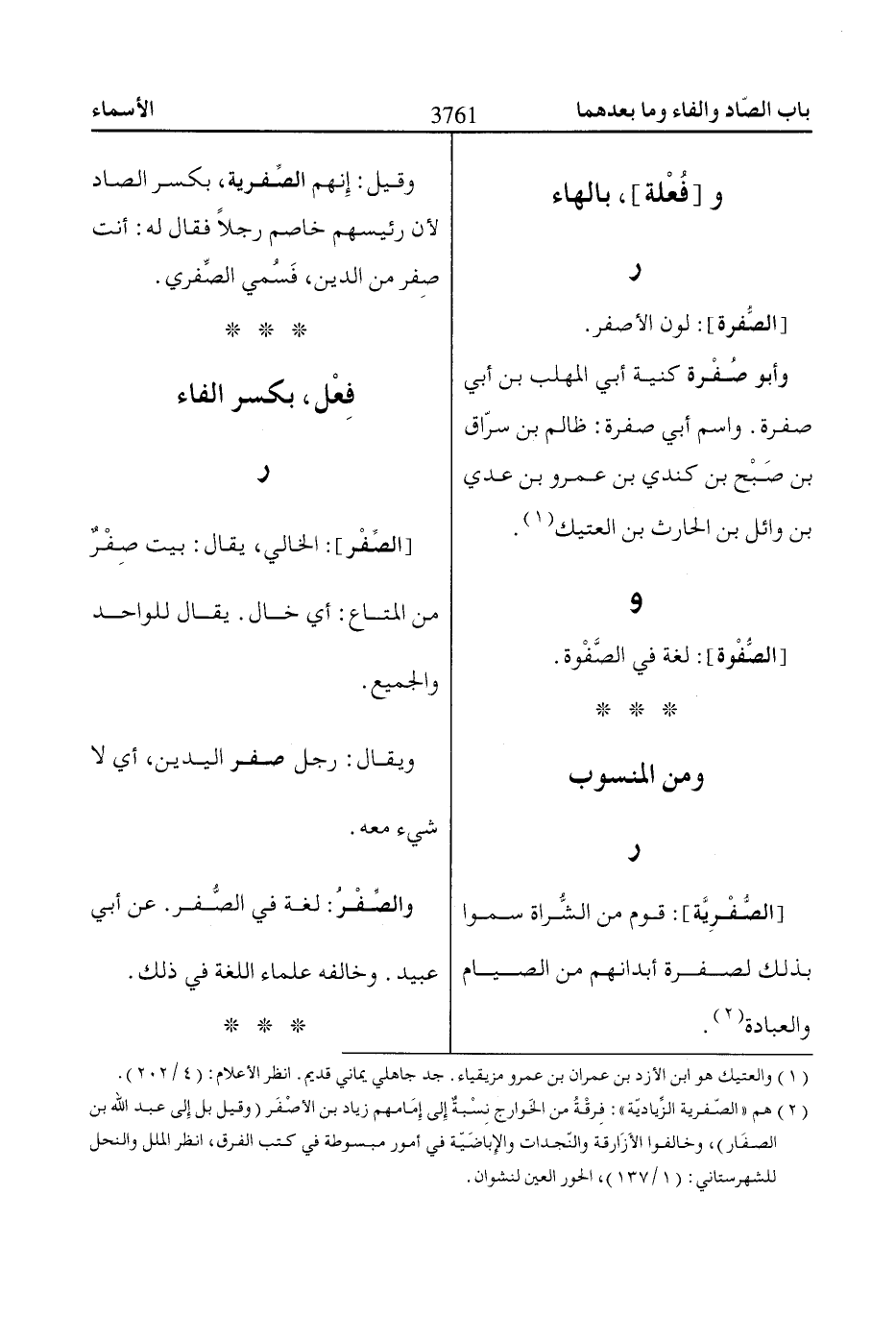 (2) هم «الصّفرية الزِّياديّة»: فِرقْةُ من الخَوارج نِسْبةٌ إِلى إِمَامهم زياد بن الأصْفَر (وقيل بل إِلى عبد اللّاه بن الصفَار)، وخالفوا الأَزَارقة والنّجدات والإِباضَيّة في أمور مبسوطة في كتب الفرق، انظر الملل والنحل للشهرستاني: (1/ 137)، الحور العين لنشوان.