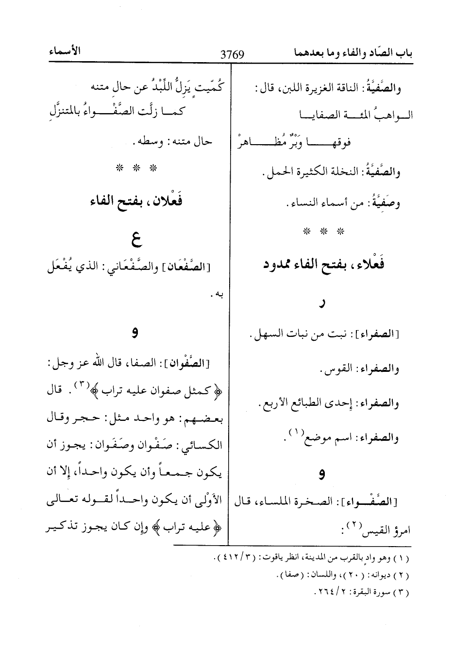 كَمَثَلِ صَفْواانٍ عَلَيْهِ تُراابٌ «3». قال بعضهم: هو واحد مثل: حجر وقال الكسائي: صَفْوان وصَفَوان: يجوز أن يكون جمعاً وأن يكون واحداً، إِلا أن الأَوْلى أن يكون واحداً لقوله تعالى عَلَيْهِ تُراابٌ وإِن كان يجوز تذكير