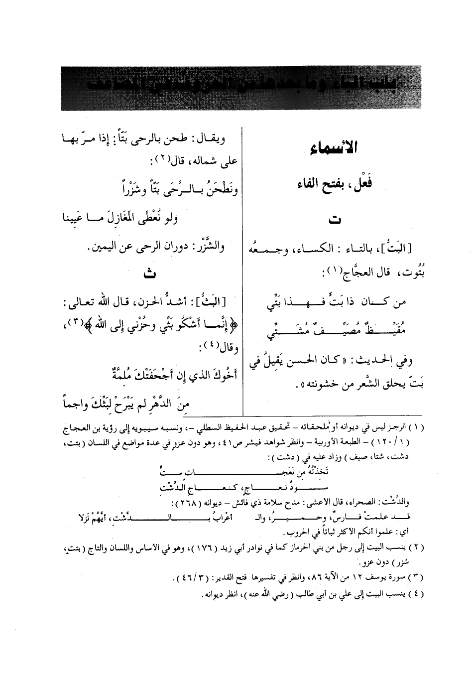 (1) الرجز ليس في ديوانه أو ملحقاته- تحقيق عبد الحفيظ السطلي-، ونسبه سيبويه إِلى رؤية بن العجاج (1/ 120) - الطبعة الأوربية- وانظر شواهد فيشر ص 41، وهو دون عزوٍ في عدة مواضع في اللسان (بتت، دشت، شتا، صيف) وزاد عليه في (دشت):