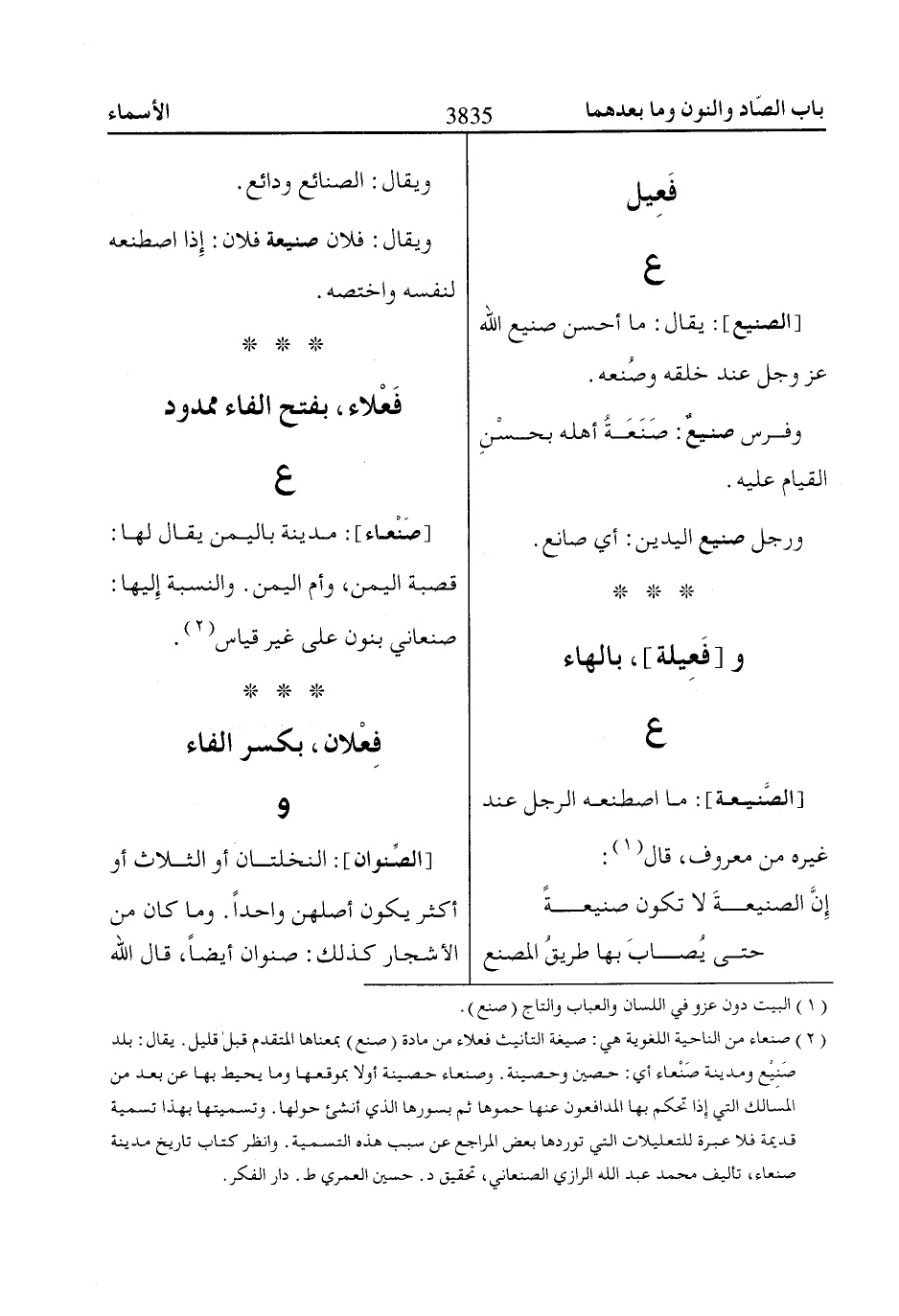 (2) صنعاء من الناحية اللغوية هي: صيغة التأنيث فعلاء من مادة (صنع) بمعناها المتقدم قبل قليل. يقال: بلد صَنِيْع ومدينة صَنْعاء أي: حصين وحصينة. وصنعاء حصينة أولا بموقعها وما يحيط بها عن بعد من المسالك التي إِذا تحكم بها المدافعون عنها حموها ثم بسورها الذي أنشئ حولها. وتسميتها بهذا تسمية قديمة فلا عبرة للتعليلات التي توردها بعض المراجع عن سبب هذه التسمية. وانظر كتاب تاريخ مدينة صنعاء، تأليف محمد عبد الله الرازي الصنعاني، تحقيق د. حسين العمري ط. دار الفكر.