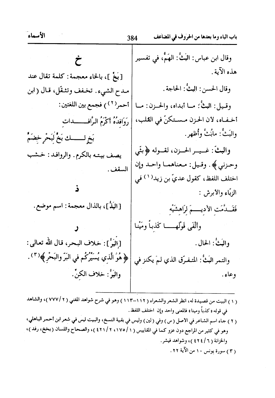(2) جاء اسم الشاعر في الأصل (س) وفي (لين) وليس في بقية النسخ، والبيت ليس في شعر ابن أحمر الباهلي، وهو في كثير من المراجع دون عزو كما في المقاييس (1/ 175، 2/ 421)، والصحاح واللسان (بخخ، رفد)، والخزانة (6/ 424)، وشواهد فيشر.