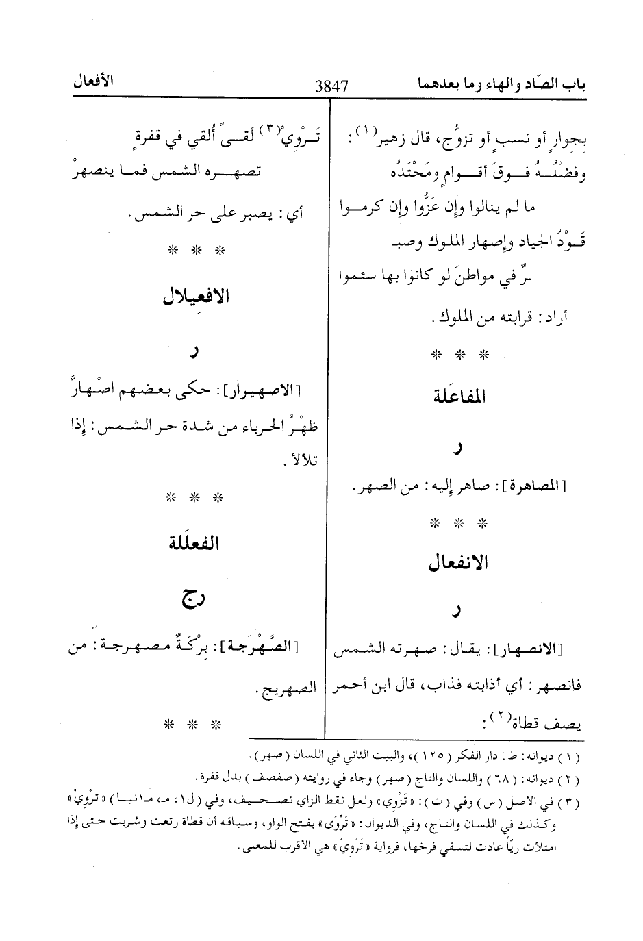 [الاصهيرار]: حكى بعضهم اصْهارَّ ظهْرُ الحرباء من شدة حر الشمس: إِذا تلألأ.