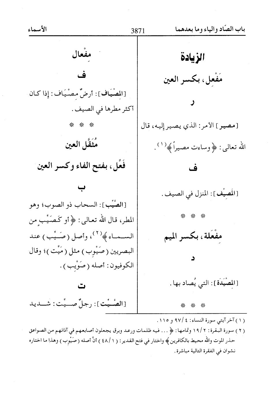 (2) سورة البقرة: 2/ 19 وتمامها: ... فِيهِ ظُلُمااتٌ وَرَعْدٌ وَبَرْقٌ يَجْعَلُونَ أَصاابِعَهُمْ فِي آذاانِهِمْ مِنَ الصَّوااعِقِ حَذَرَ الْمَوْتِ وَاللّاهُ مُحِيطٌ بِالْكاافِرِينَ واختار في فتح القدير: (1/ 48) أنَّ أصله (صَيْوِب) وهذا ما اختاره نشوان في الفقرة التالية مباشرة.