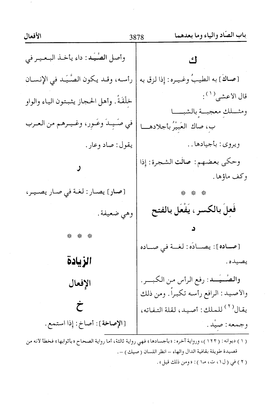 وأصل الصَّيَد: داء يأخذ البعير في رأسه، وقد يكون الصَّيَد في الإِنسان خِلْقَةً. وأهل الحجاز يثبتون الياء والواو في صَيِدَ وعَوِر، وغيرهم من العرب يقول: صاد وعار.