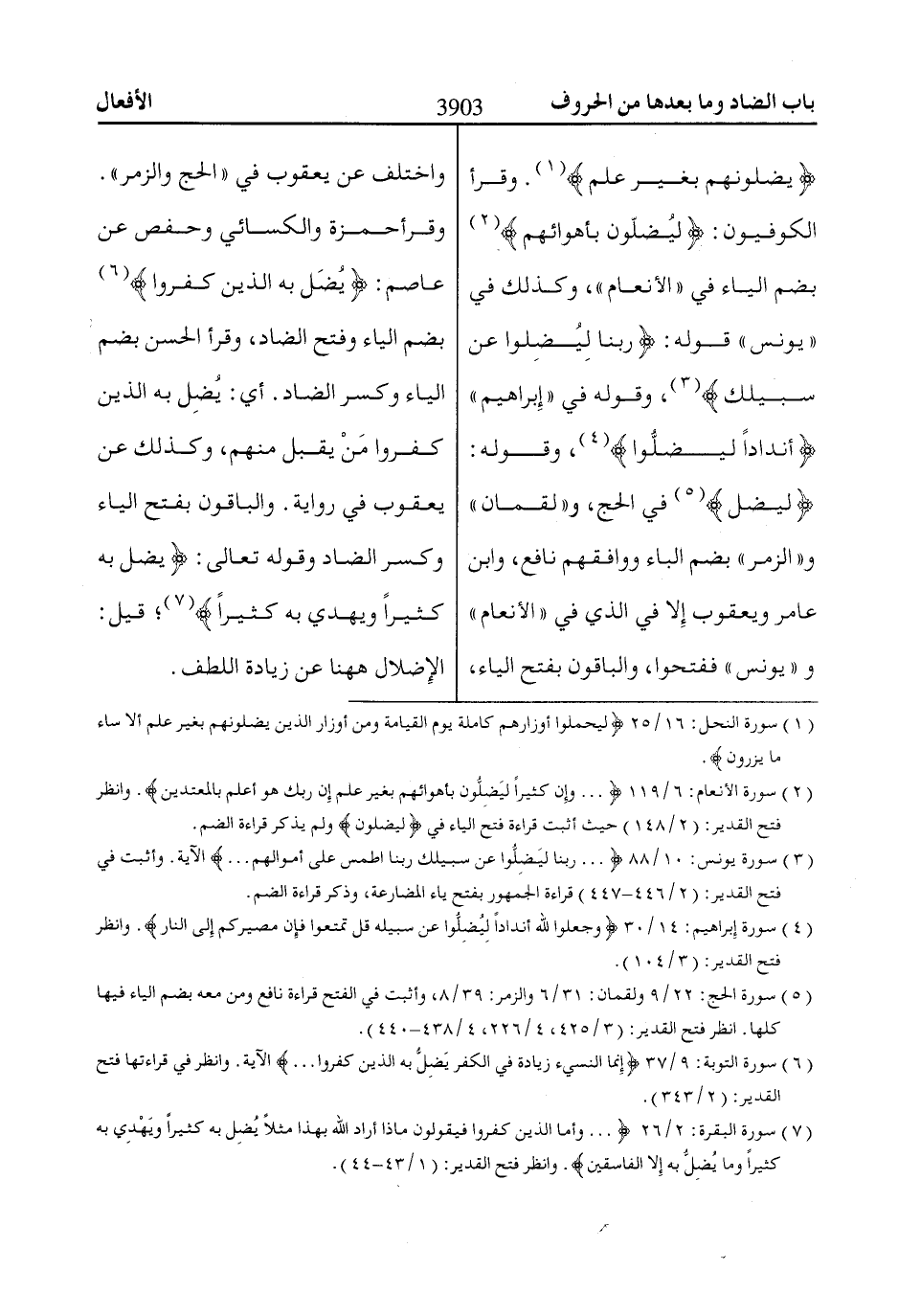 (2) سورة الأنعام: 6/ 119 ... وَإِنَّ كَثِيراً لَيُضِلُّونَ بِأَهْواائِهِمْ بِغَيْرِ عِلْمٍ إِنَّ رَبَّكَ هُوَ أَعْلَمُ بِالْمُعْتَدِينَ. وانظر فتح القدير: (2/ 148) حيث أثبت قراءة فتح الياء في لَيُضِلُّونَ ولم يذكر قراءة الضم.