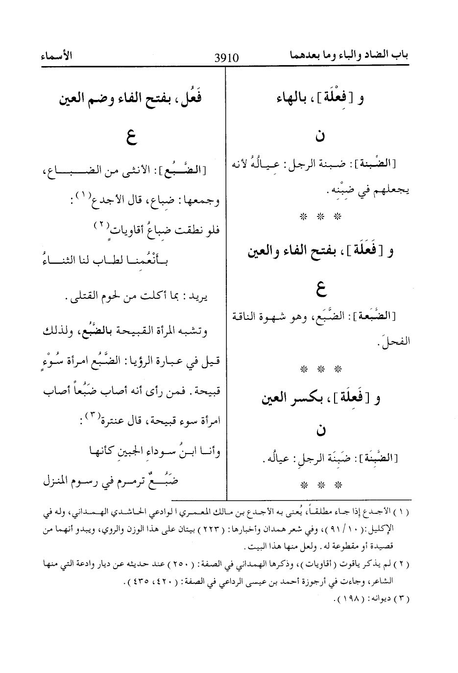 [الضَّبُع]: الأنثى من الضباع، وجمعها: ضِباع، قال الأجدع «1»: