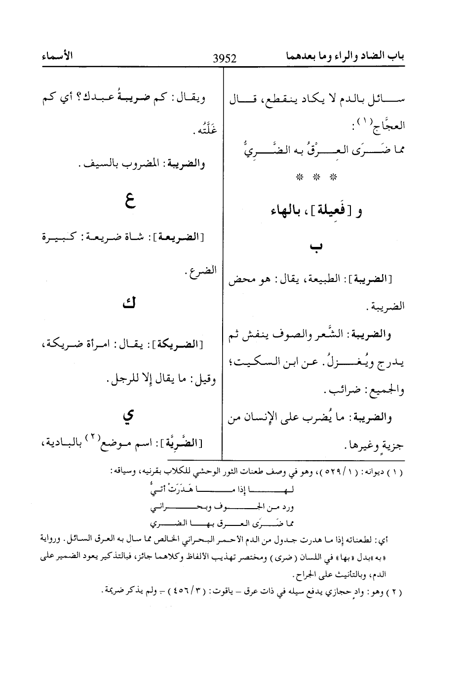 أي: لطعناته إِذا ما هدرت جدول من الدم الأحمر البحراني الخالص مما سال به العرق السائل. ورواية «به» بدل «بها» في اللسان (ضرى) ومختصر تهذيب الألفاظ وكلاهما جائز، فبالتذكير يعود الضمير على الدم، وبالتأنيث على الجراح.