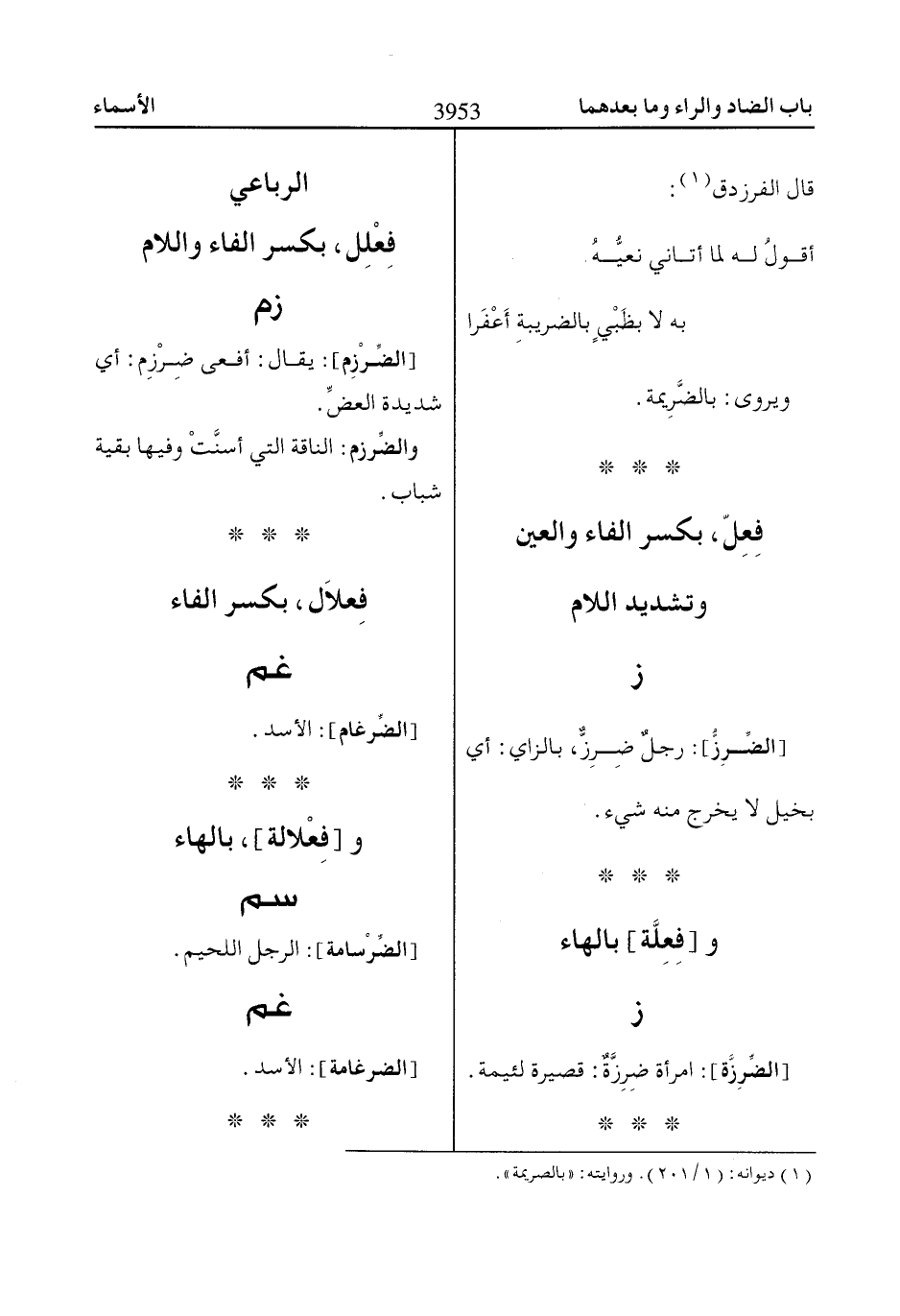 [الضِّرْزِم]: يقال: أفعى ضِرْزِم: أي شديدة العضِّ.