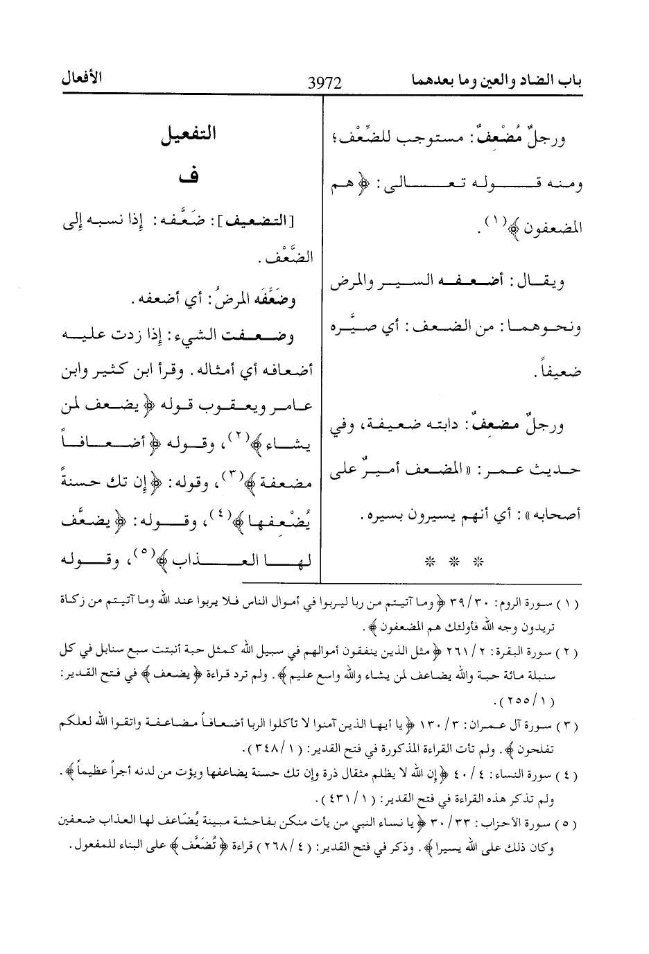 وضعفت الشيء: إِذا زدت عليه أضعافه أي أمثاله. وقرأ ابن كثير وابن عامر ويعقوب قوله يضعف لمن يشاء «2»، وقوله أضعافا مضعفة «3»، وقوله: إن تك حسنة يضعفها «4»، وقوله: يضعف لها العذاب «5»، وقوله