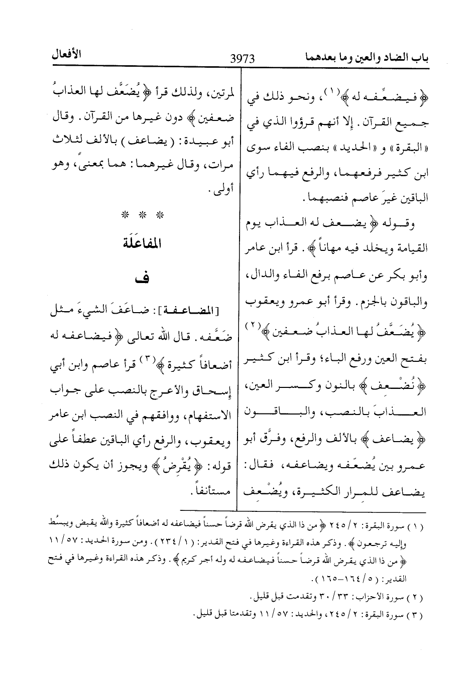 (1) سورة البقرة: 2/ 245 مَنْ ذَا الَّذِي يُقْرِضُ اللّاهَ قَرْضاً حَسَناً فَيُضااعِفَهُ لَهُ أَضْعاافاً كَثِيرَةً وَاللّاهُ يَقْبِضُ وَيَبْصُطُ وَإِلَيْهِ تُرْجَعُونَ. وذكر هذه القراءة وغيرها في فتح القدير: (1/ 234). ومن سورة الحديد: 57/ 11 مَنْ ذَا الَّذِي يُقْرِضُ اللّاهَ قَرْضاً حَسَناً فَيُضااعِفَهُ لَهُ وَلَهُ أَجْرٌ كَرِيمٌ. وذكر هذه القراءة وغيرها في فتح القدير: (5/ 164 - 165).