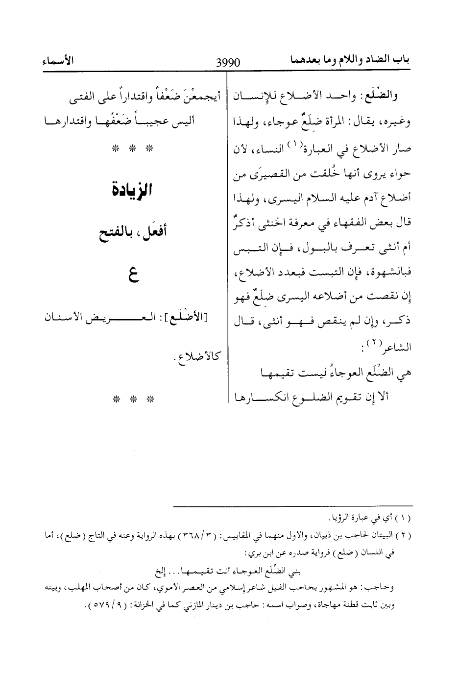 (2) البيتان لحاجب بن ذبيان، والأول منهما في المقاييس: (3/ 368) بهذه الرواية وعنه في التاج (ضلع)، أما في اللسان (ضلع) فرواية صدره عن ابن بري: