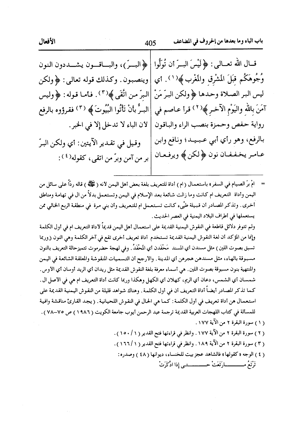 قال اللّاه تعالى: لَيْسَ الْبِرَّ أَنْ تُوَلُّوا وُجُوهَكُمْ قِبَلَ الْمَشْرِقِ وَالْمَغْرِبِ «1». أي ليس البر الصلاة وحدها وَلاكِنَّ الْبِرَّ مَنْ آمَنَ بِاللّاهِ وَالْيَوْمِ الْآخِرِ «2» قرأ عاصم في رواية حفص وحمزة بنصب الراء والباقون بالرفع، وهو رأي أبي عبيد؛ ونافع وابن عامر يخففان نون لكنْ ويرفعان البرُّ، والباقون يشددون النون وينصبون. وكذلك قوله تعالى: وَلاكِنَّ الْبِرَّ مَنِ اتَّقى «3». فأما قوله: وَلَيْسَ الْبِرُّ بِأَنْ تَأْتُوا الْبُيُوتَ «3» فقرؤوه بالرفع لأن الباء لا تدخل إِلا في الخبر.