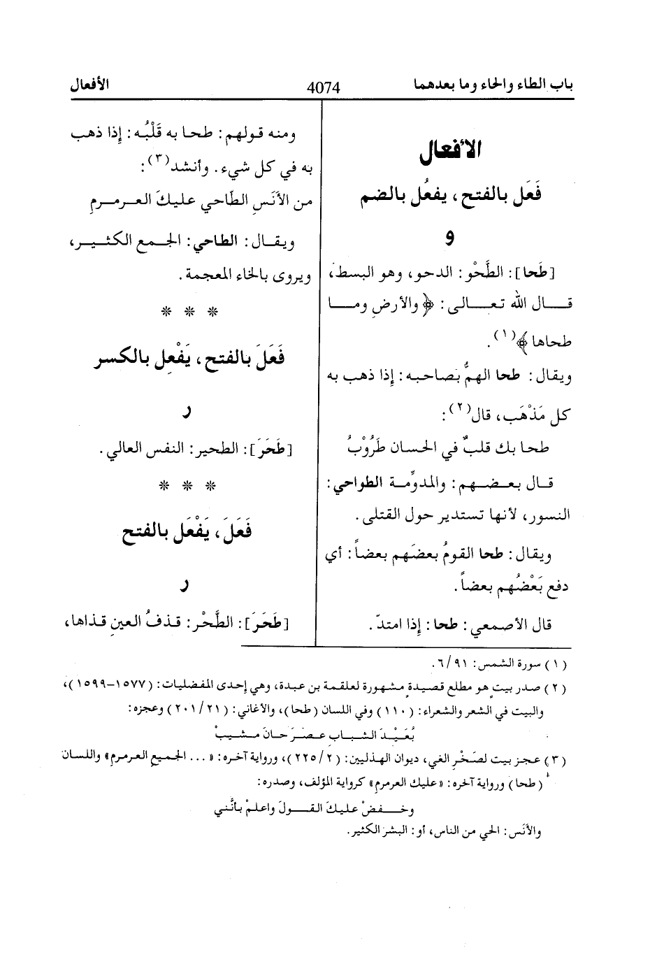 (2) صدر بيت هو مطلع قصيدة مشهورة لعلقمة بن عبدة، وهي إحدى المفضليات: (1577 - 1599)، والبيت في الشعر والشعراء: (110) وفي اللسان (طحا)، والاغاني: (21/ 201) وعجزه: