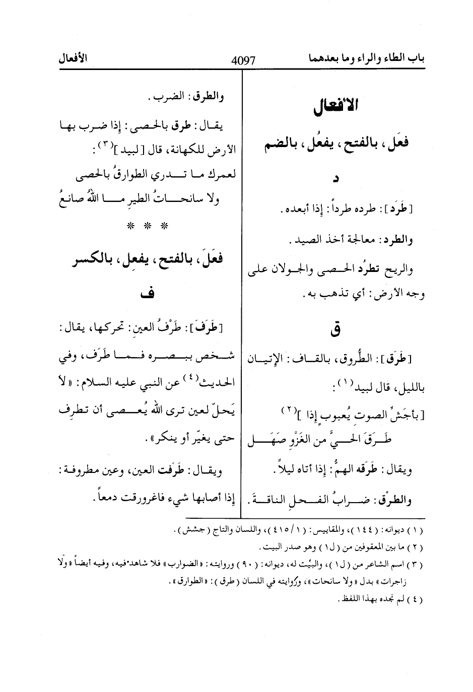[طَرَق]: الطُّروق، بالقاف: الإتيان بالليل، قال لبيد «1»: