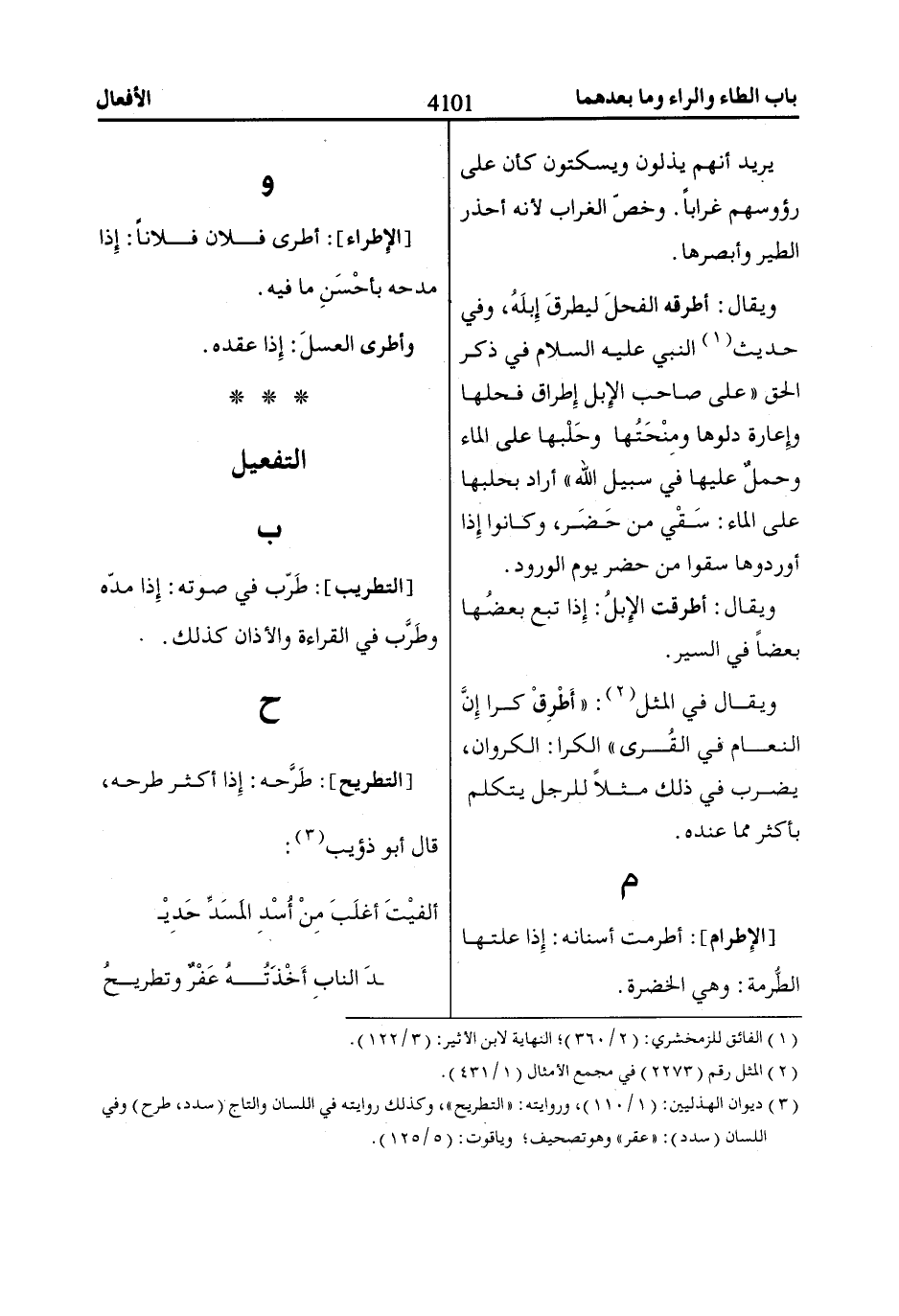 (3) ديوان الهذليين: (1/ 110)، وروايته: «التطريح»، وكذلك روايته في اللسان والتاج (سدد، طرح) وفي اللسان (سدد): «عقر» وهو تصحيف؛ وياقوت: (5/ 125).