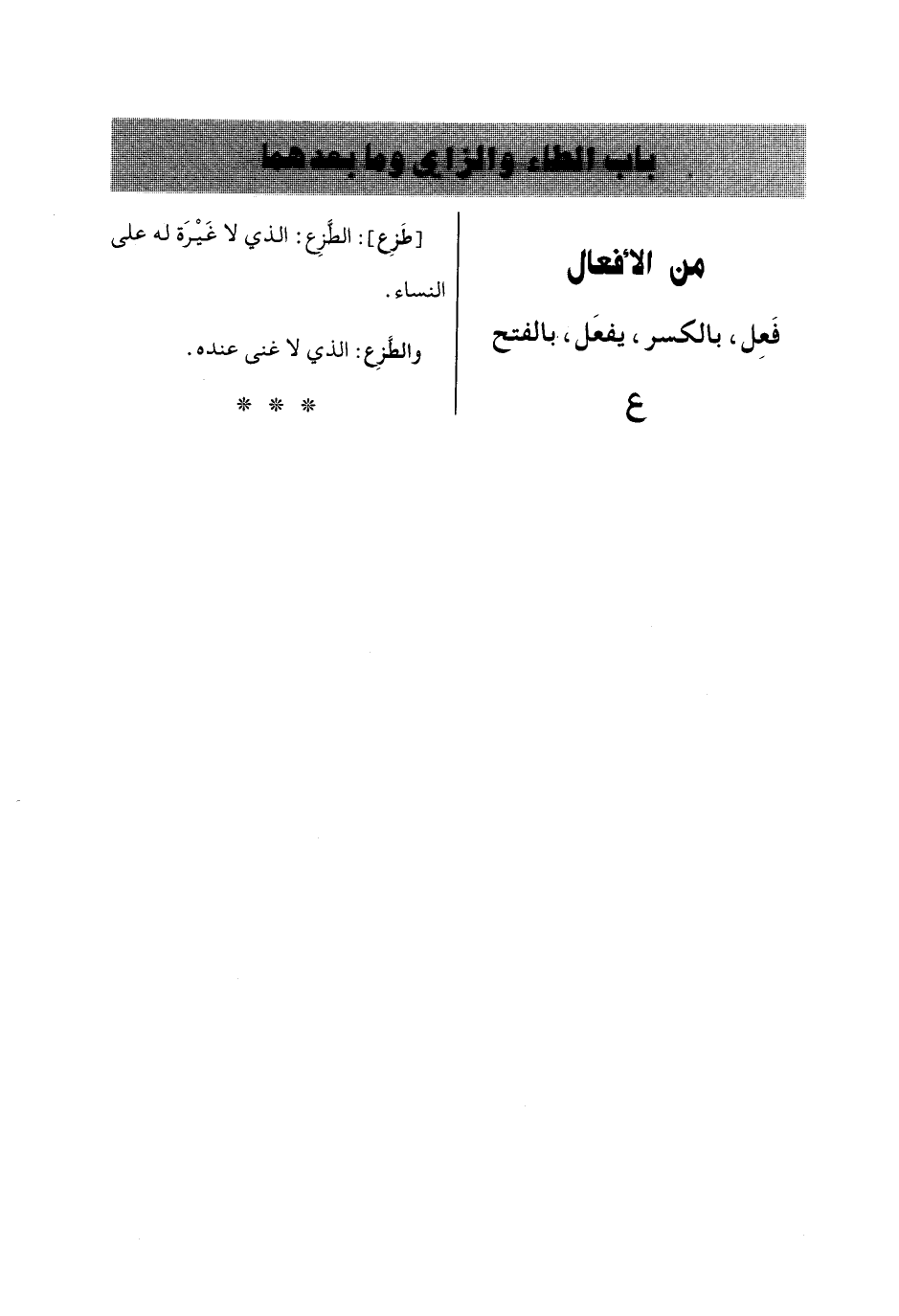 [طَزِع]: الطَّزِع: الذي لا غَيْرَة له على النساء.