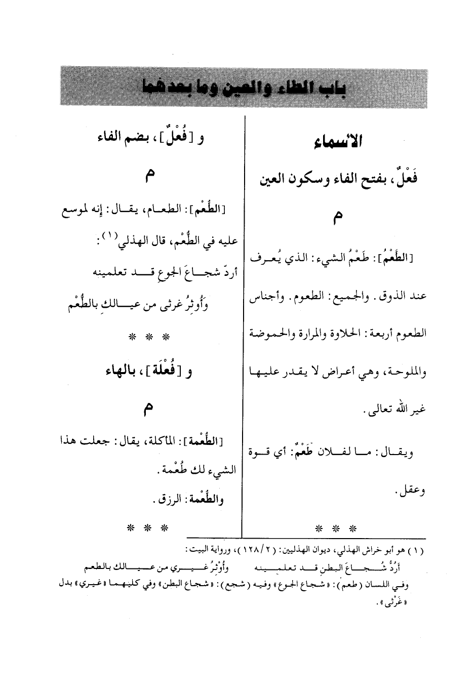 [الطُّعْم]: الطعام، يقال: إنه لموسع عليه في الطُّعْم، قال الهذلي «1»: