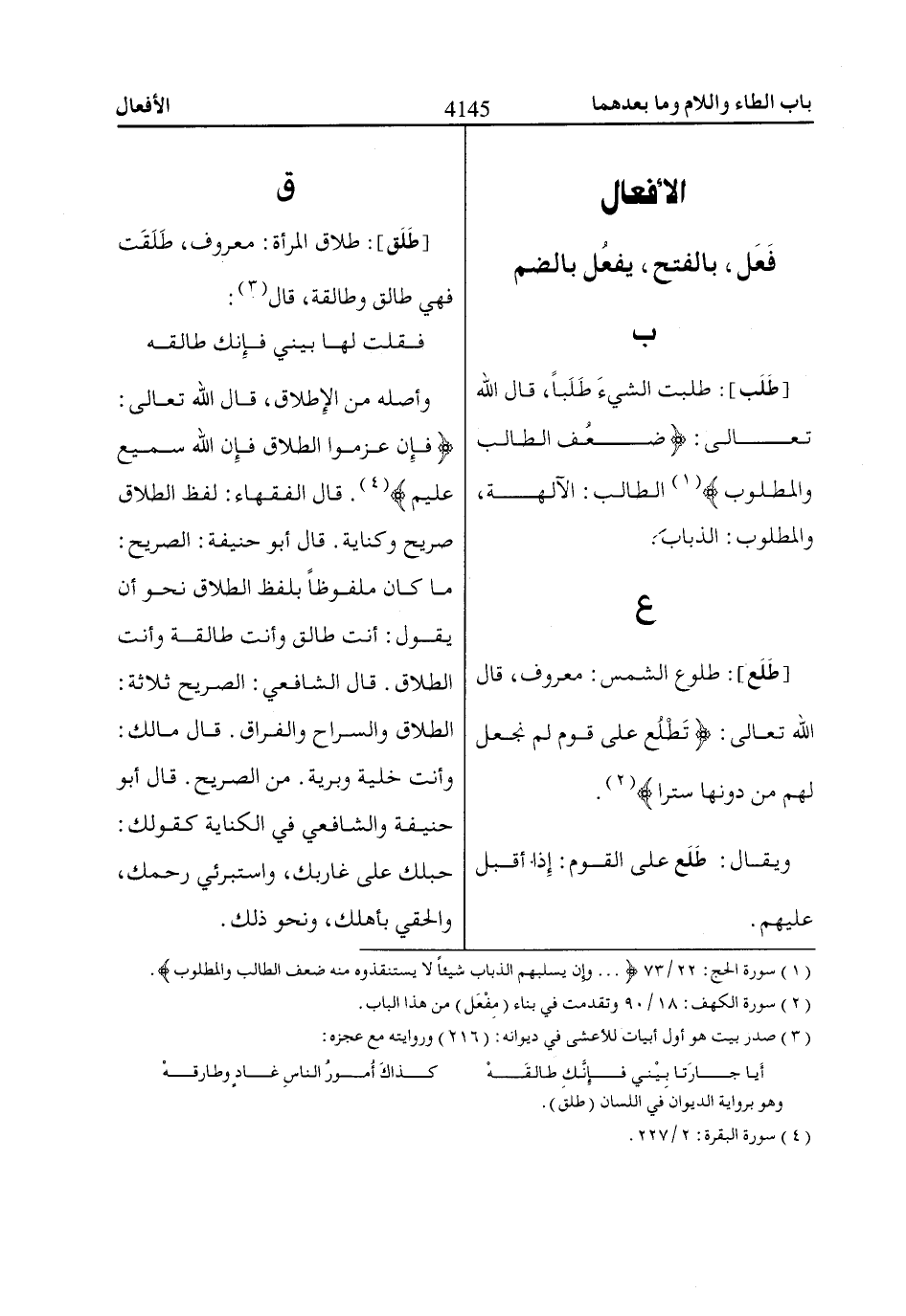 [طَلَق]: طلاق المرأة: معروف، طَلَقَت فهي طالق وطالقة، قال «3»: