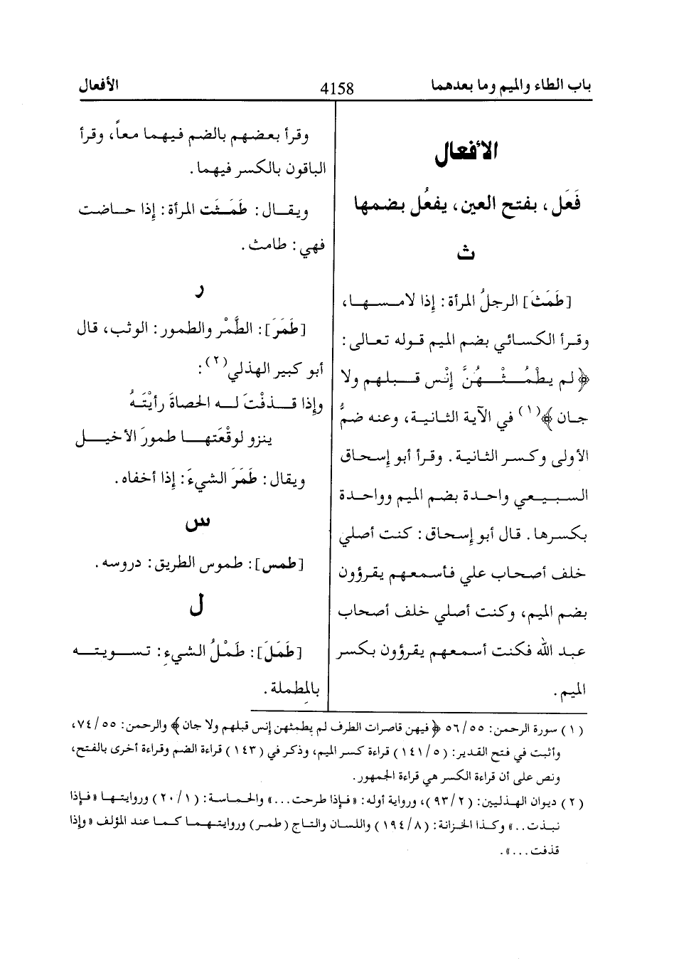(1) سورة الرحمن: 55/ 56 فِيهِنَّ قااصِرااتُ الطَّرْفِ لَمْ يَطْمِثْهُنَّ إِنْسٌ قَبْلَهُمْ وَلاا جَانٌّ والرحمن: 55/ 74، وأثبت في فتح القدير: (5/ 141) قراءة كسر الميم، وذكر في (143) قراءة الضم وقراءة أخرى بالفتح، ونص على أن قراءة الكسر هي قراءة الجمهور.