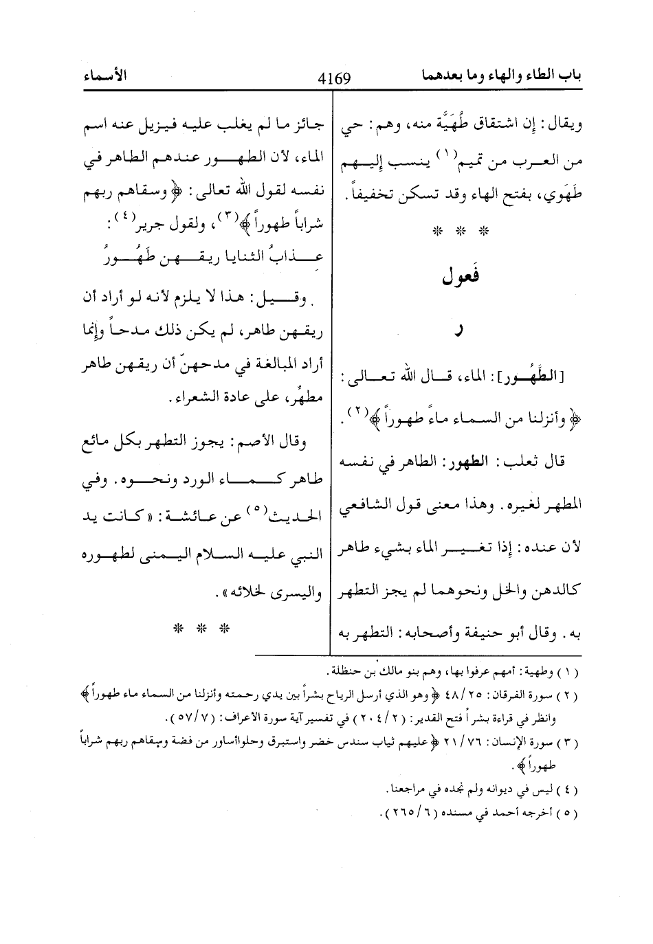 قال ثعلب: الطهور: الطاهر في نفسه المطهر لغيره. وهذا معنى قول الشافعي لأن عنده: إذا تغير الماء بشيء طاهر كالدهن والخل ونحوهما لم يجز التطهر به. وقال أبو حنيفة وأصحابه: التطهر به جائز ما لم يغلب عليه فيزيل عنه اسم الماء، لأن الطهور عندهم الطاهر في نفسه لقول الله تعالى: وَسَقااهُمْ رَبُّهُمْ شَرااباً طَهُوراً «3»، ولقول جرير «4»: