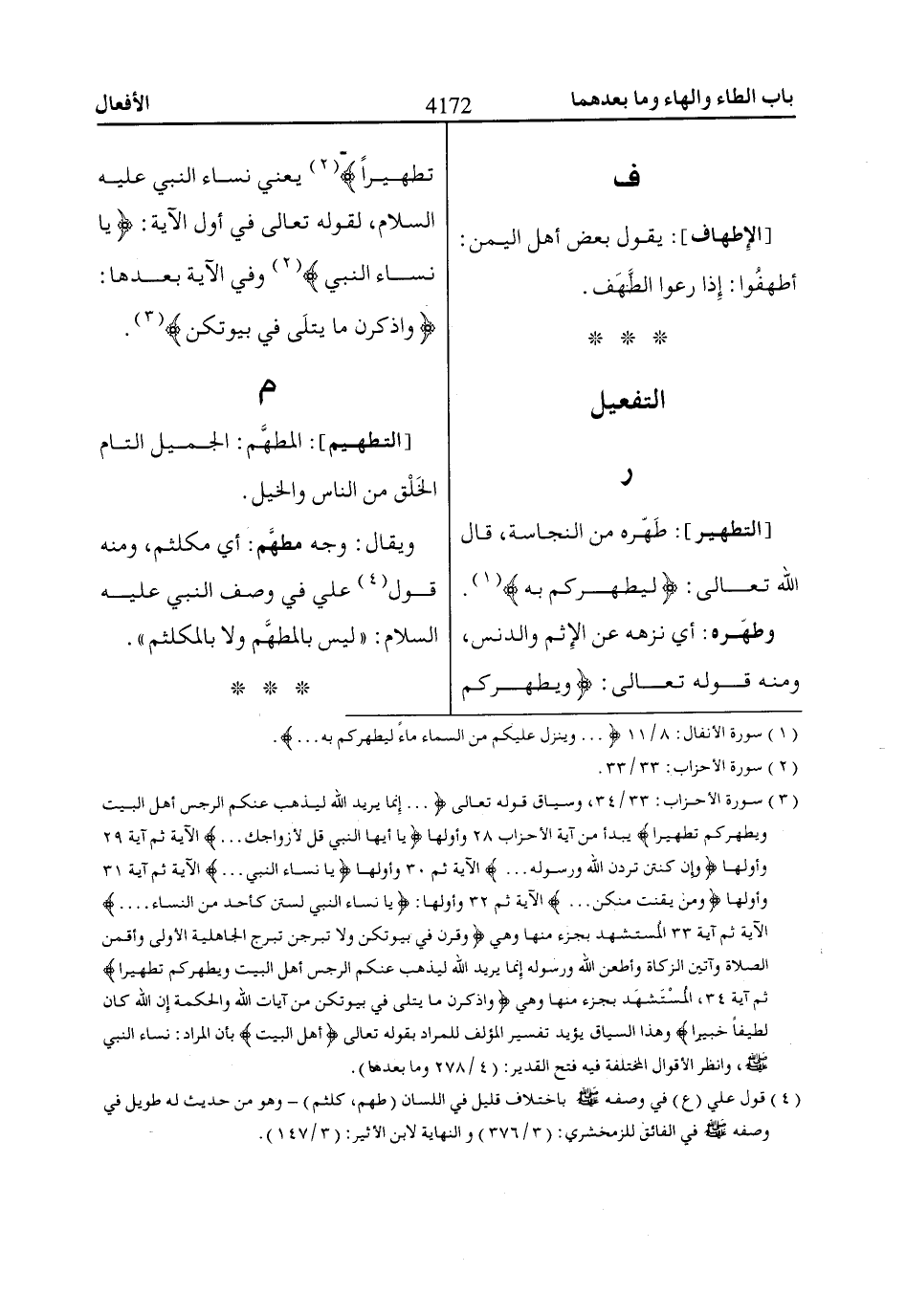 (3) سورة الأحزاب: 33/ 34، وسياق قوله تعالى ... إِنَّماا يُرِيدُ اللّاهُ لِيُذْهِبَ عَنْكُمُ الرِّجْسَ أَهْلَ الْبَيْتِ وَيُطَهِّرَكُمْ تَطْهِيراً يبدأ من آية الأحزاب 28 وأولها ياا أَيُّهَا النَّبِيُّ قُلْ لِأَزْوااجِكَ ... الأية ثم آية 29 وأولها وَإِنْ كُنْتُنَّ تُرِدْنَ اللّاهَ وَرَسُولَهُ ... الآية ثم 30 وأولها ياا نِسااءَ النَّبِيِّ ... الآية ثم آية 31 وأولها وَمَنْ يَقْنُتْ مِنْكُنَّ ... الآية ثم 32 وأولها: ياا نِسااءَ النَّبِيِّ لَسْتُنَّ كَأَحَدٍ مِنَ النِّسااءِ ... الآية ثم آية 33 المستشهد بجزء منها وهي وَقَرْنَ فِي بُيُوتِكُنَّ وَلاا تَبَرَّجْنَ تَبَرُّجَ الْجااهِلِيَّةِ الْأُولى وَأَقِمْنَ الصَّلااةَ وَآتِينَ الزَّكااةَ وَأَطِعْنَ اللّاهَ وَرَسُولَهُ إِنَّماا يُرِيدُ اللّاهُ لِيُذْهِبَ عَنْكُمُ الرِّجْسَ أَهْلَ الْبَيْتِ وَيُطَهِّرَكُمْ تَطْهِيراً ثم آية 34، المستَشهَد بجزء منها وهي وَاذْكُرْنَ ماا يُتْلى فِي بُيُوتِكُنَّ مِنْ آيااتِ اللّاهِ وَالْحِكْمَةِ إِنَّ اللّاهَ كاانَ لَطِيفاً خَبِيراً وهذا السياق يؤيد تفسير المؤلف للمراد بقوله تعالى أَهْلَ الْبَيْتِ بأن المراد: نساء النبي صلى الله عليه وسلم، وانظر الأقوال المختلفة فيه فتح القدير: (4/ 278 وما بعدها).