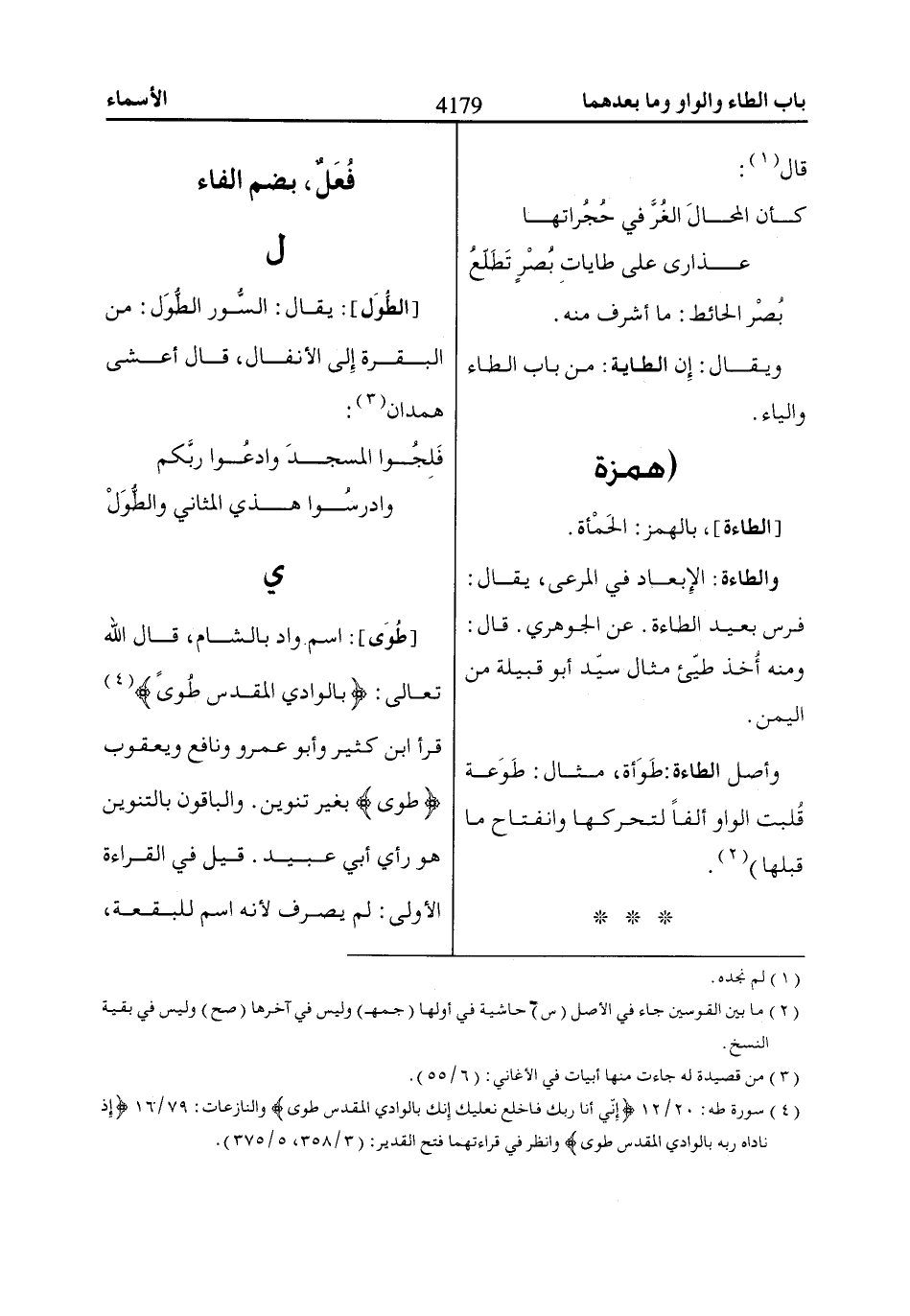 (4) سورة طه: 20/ 12 إِنِّي أَنَا رَبُّكَ فَاخْلَعْ نَعْلَيْكَ إِنَّكَ بِالْواادِ الْمُقَدَّسِ طُوىً والنازعات: 79/ 16 إِذْ ناادااهُ رَبُّهُ بِالْواادِ الْمُقَدَّسِ طُوىً وانظر في قراءتهما فتح القدير: (3/ 358، 5/ 375).