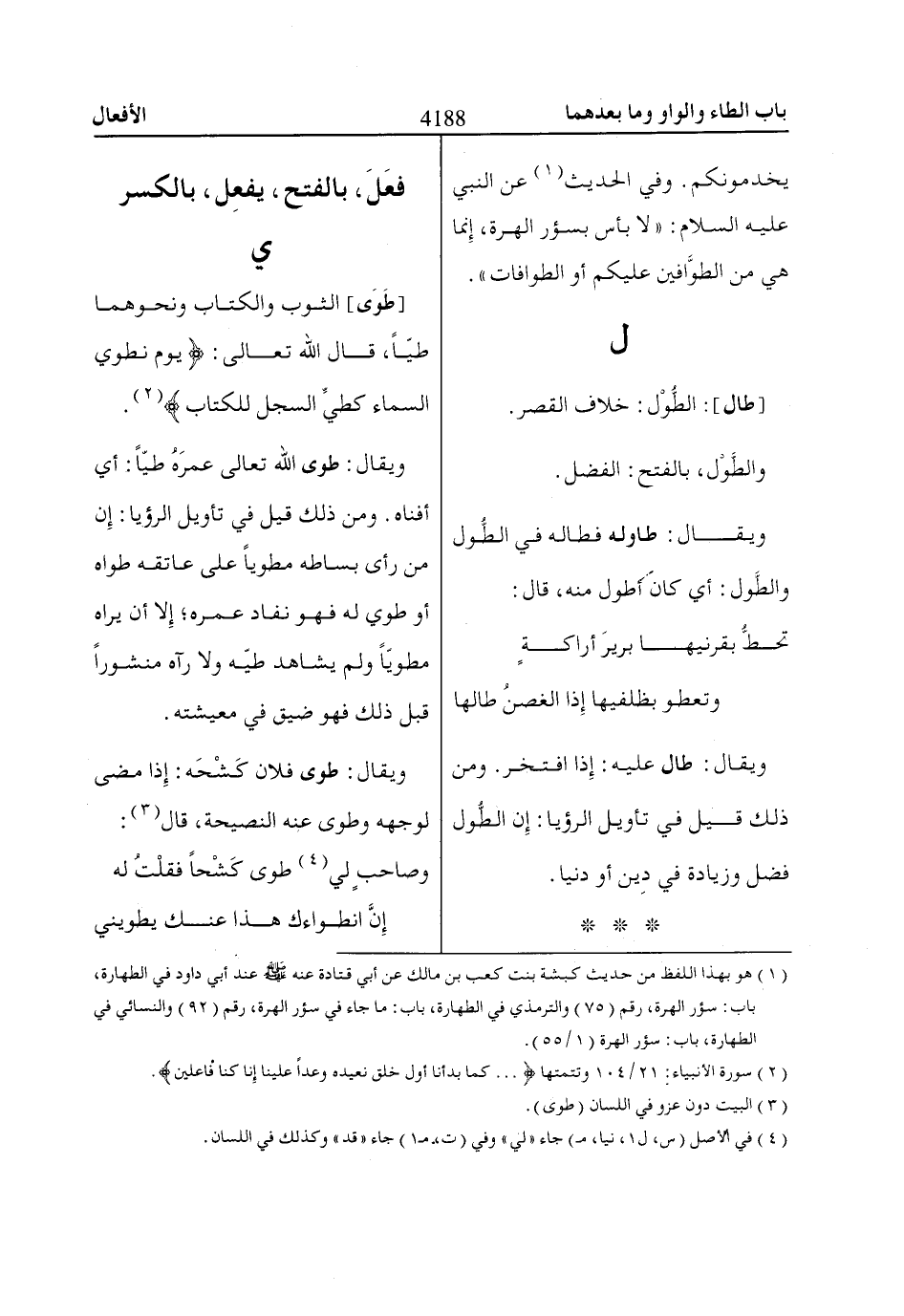 [طَوَى] الثوب والكتاب ونحوهما طيّاً، قال الله تعالى: يَوْمَ نَطْوِي السَّمااءَ كَطَيِّ السِّجِلِّ للكتاب «2».
