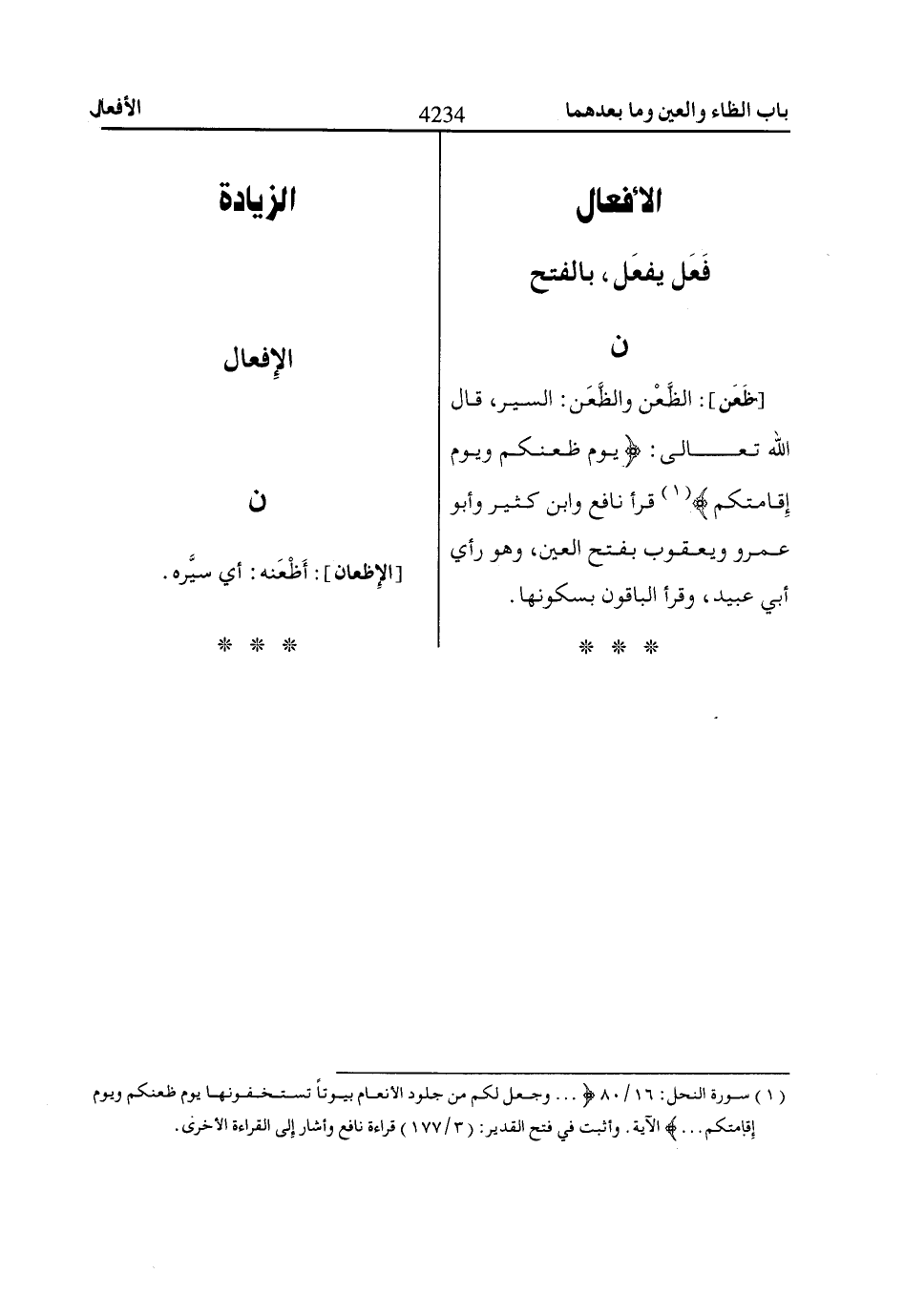 (1) سورة النحل: 16/ 80 ... وَجَعَلَ لَكُمْ مِنْ جُلُودِ الْأَنْعاامِ بُيُوتاً تَسْتَخِفُّونَهاا يَوْمَ ظَعْنِكُمْ وَيَوْمَ إِقاامَتِكُمْ ... الآية. وأثبت في فتح القدير: (3/ 177) قراءة نافع وأشار إلى القراءة الأخرى.
