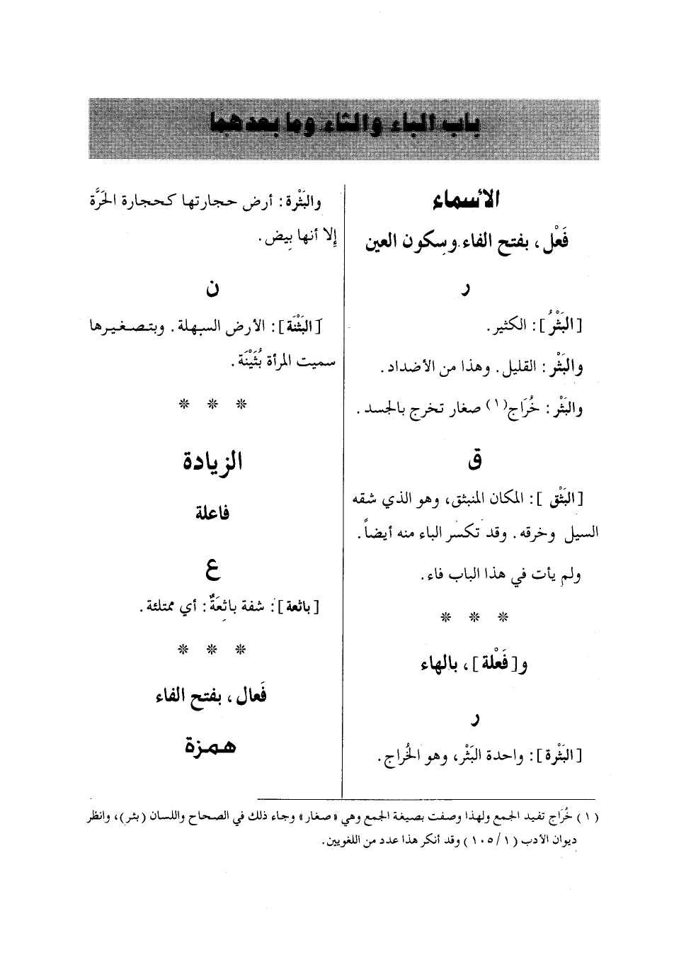 (1) خُرَاج تفيد الجمع ولهذا وصفت بصيغة الجمع وهي «صغار» وجاء ذلك في الصحاح واللسان (بثر)، وانظر ديوان الأدب (1/ 105) وقد أنكر هذا عدد من اللغويين.