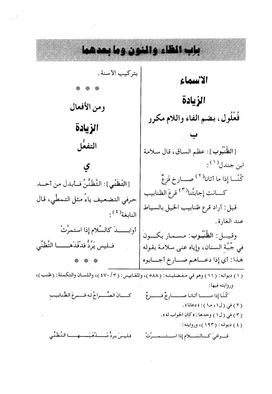 (1) ديوانه: (11) وهو في مفضليته: (588)، والمقاييس: (3/ 470)، واللسان والتكملة: (ظنب)، وروايته فيها: