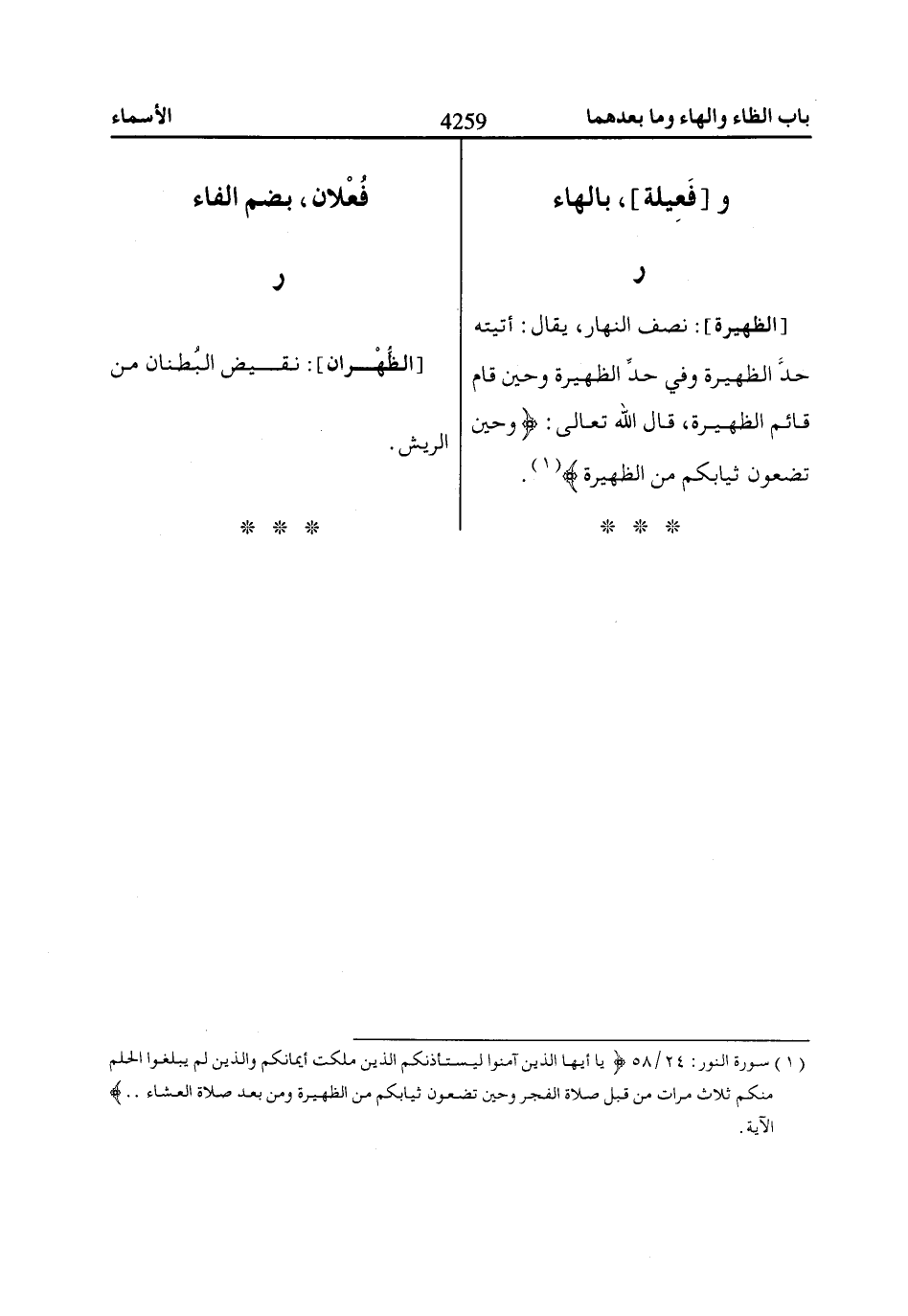 [الظهيرة]: نصف النهار، يقال: أتيته حدَّ الظهيرة وفي حدِّ الظهيرة وحين قام قائم الظهيرة، قال الله تعالى: وَحِينَ تَضَعُونَ ثِياابَكُمْ مِنَ الظَّهِيرَةِ «1».