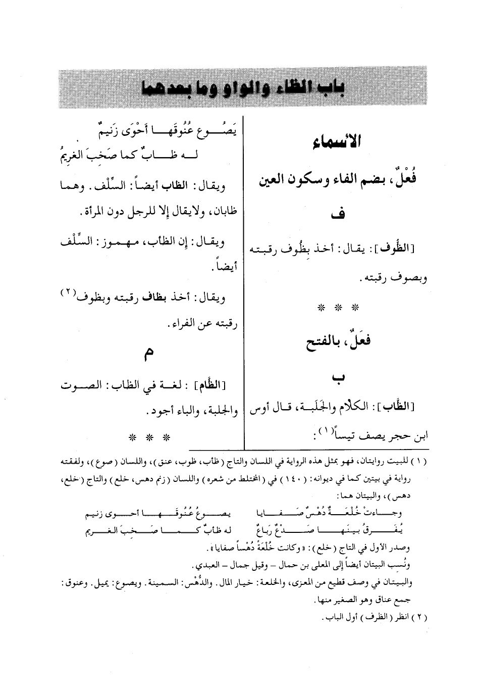 (1) للبيت روايتان، فهو بمثل هذه الرواية في اللسان والتاج (ظأب، ظوب، عنق)، واللسان (صوع)، ولفقته رواية في بيتين كما في ديوانه: (140) في (المختلط من شعره) واللسان (زنم دهس، خلع) والتاج (خلع، دهس)، والبيتان هما: