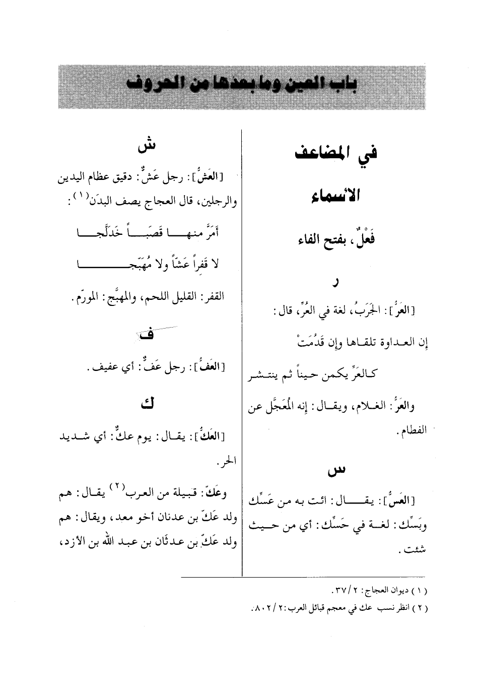 [العَشُّ]: رجل عَشٌّ: دقيق عظام اليدين والرجلين، قال العجاج يصف البدَن «1»: