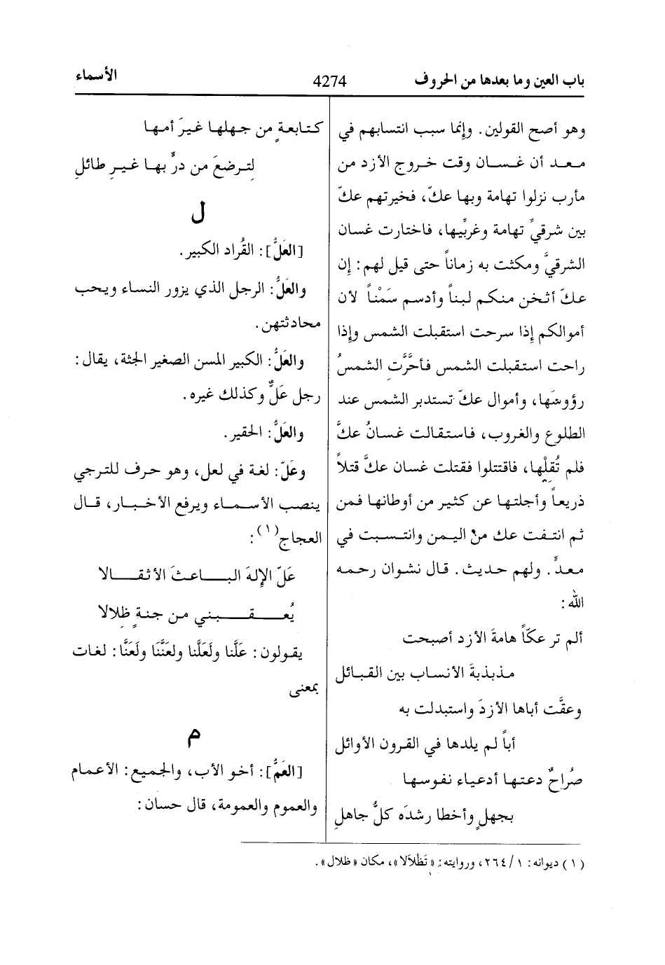 وعَلّ: لغة في لعل، وهو حرف للترجي ينصب الأسماء ويرفع الأخبار، قال العجاج «1»: